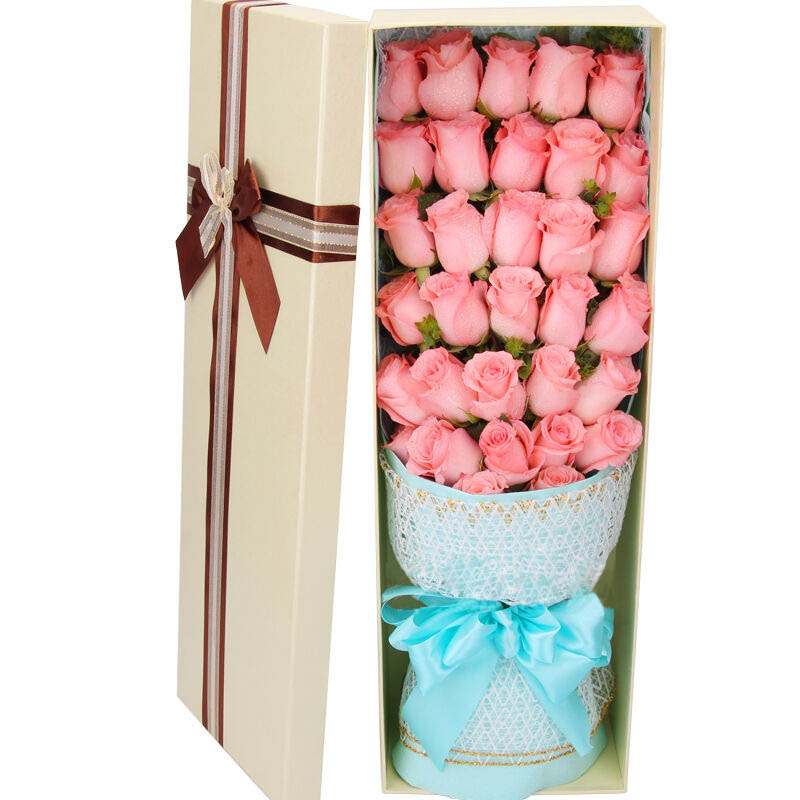 包 装:内层白色W网,外层天蓝色包装纸包装,W网托底,绿色缎带花结束扎,长方形白色礼盒。
