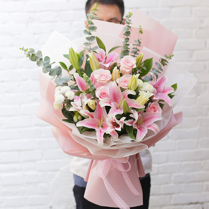 花 材:6朵粉玫瑰,6支粉色多头香水百合,搭配白色小雏菊(或洋桔梗)、尤加利叶、栀子叶装饰。