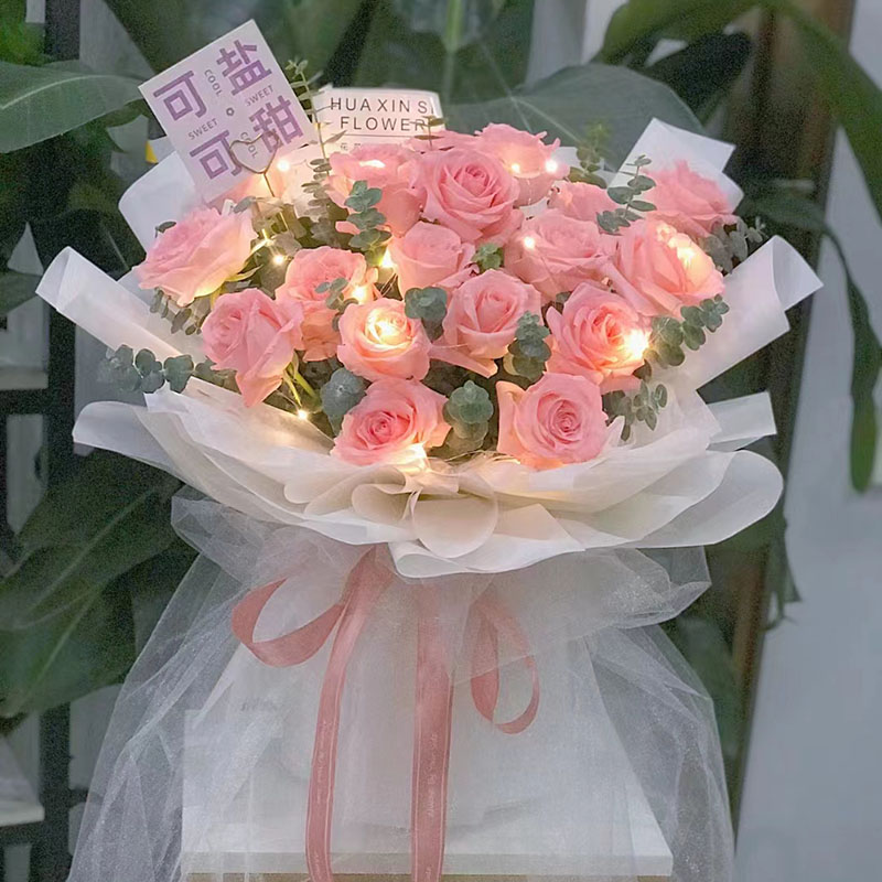 花材: 19朵精品粉玫瑰,1条灯带,搭配尤加利叶间插。