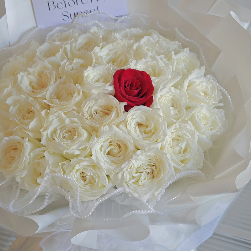 花材: 98朵白玫瑰,1朵红玫瑰,红玫瑰居中。