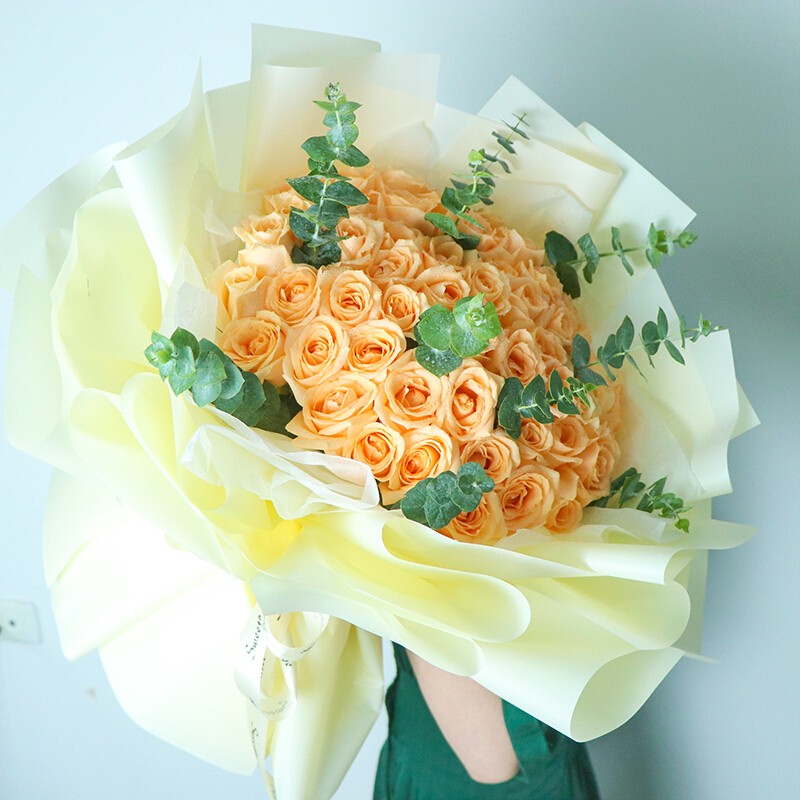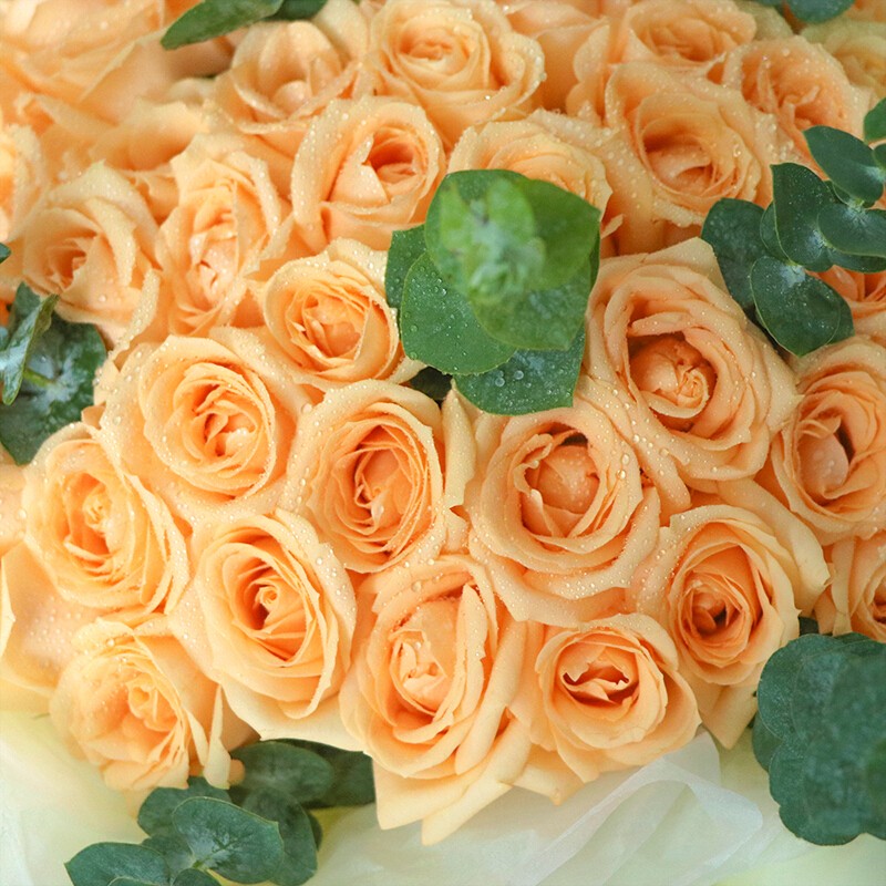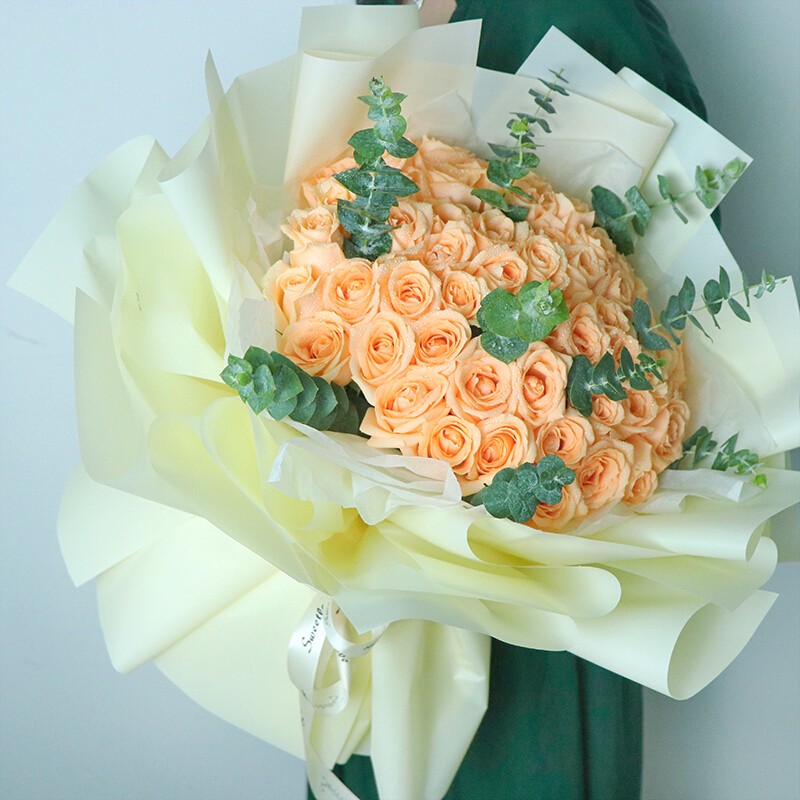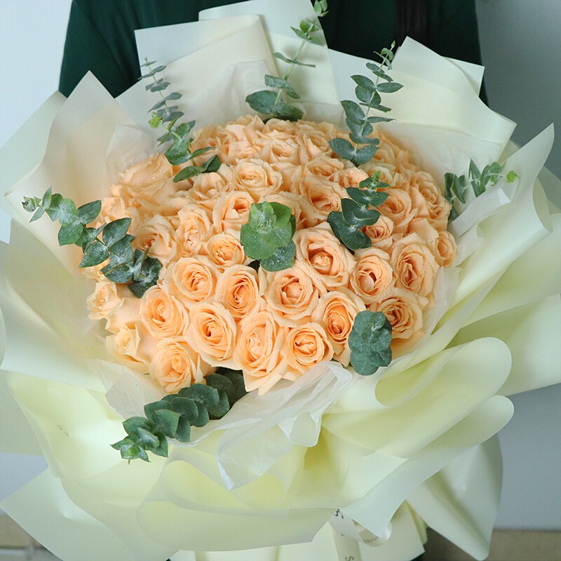 花材: 精选52朵香槟玫瑰,搭配尤加利叶装饰。