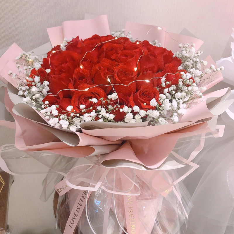 花材: 精选33朵红玫瑰,1条灯串,满天星环绕。