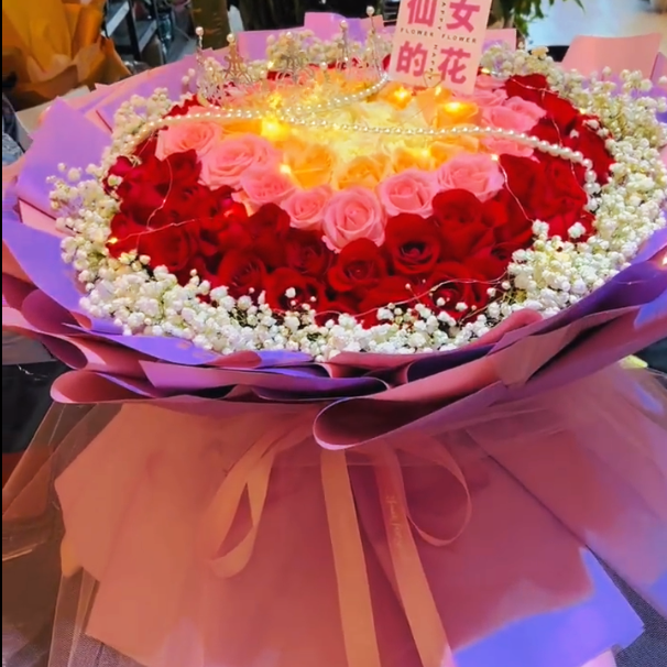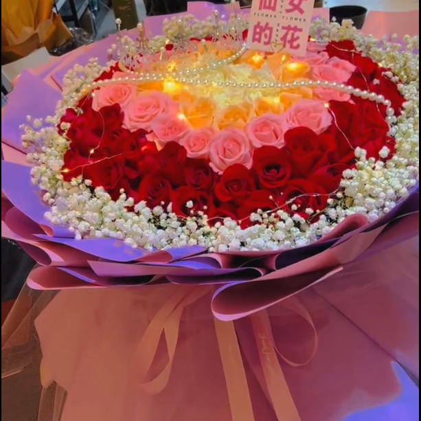 花 材:99朵玫瑰混搭,1条灯带,1条珠链,1顶皇冠装饰花面,香槟玫瑰在最里层,粉玫瑰居中,红玫瑰外围,满天星环绕装饰。
