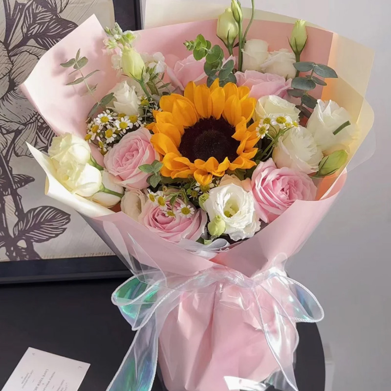 花 材:5朵粉红雪山玫瑰,1朵向日葵,搭配洋甘菊,多头洋桔梗,尤加利叶装饰。