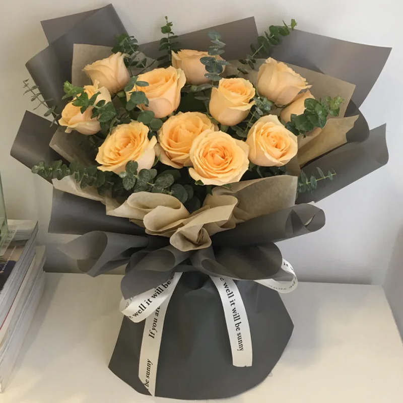 花材: 精选11枝香槟玫瑰,尤加利叶装饰。