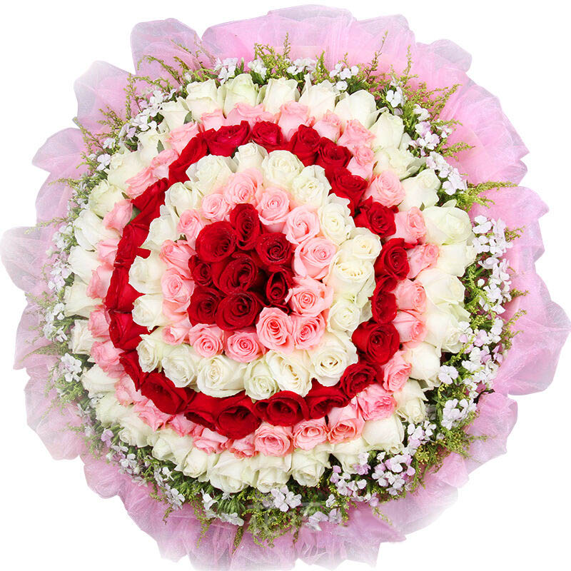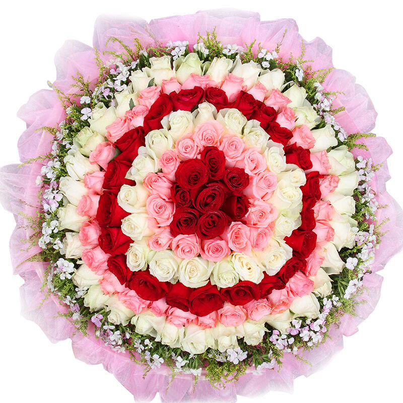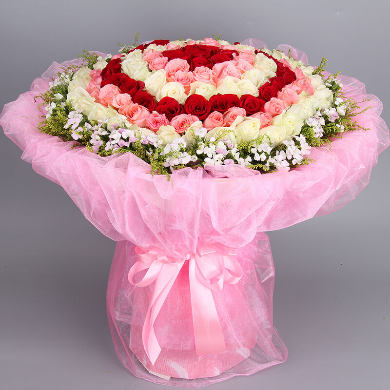 花材: 精选顶级红玫瑰,香槟玫瑰,粉玫瑰共99朵,黄莺,相思梅围绕。