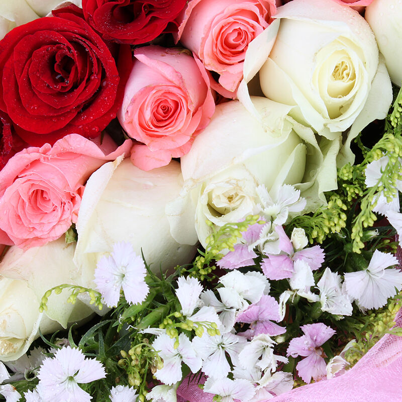花 材:精选顶级红玫瑰,香槟玫瑰,粉玫瑰共99朵,黄莺,相思梅围绕。