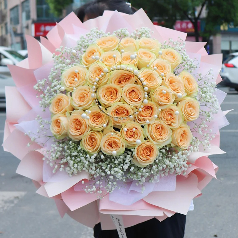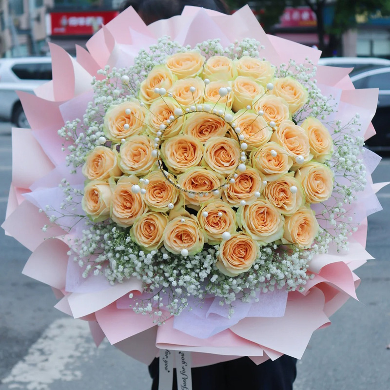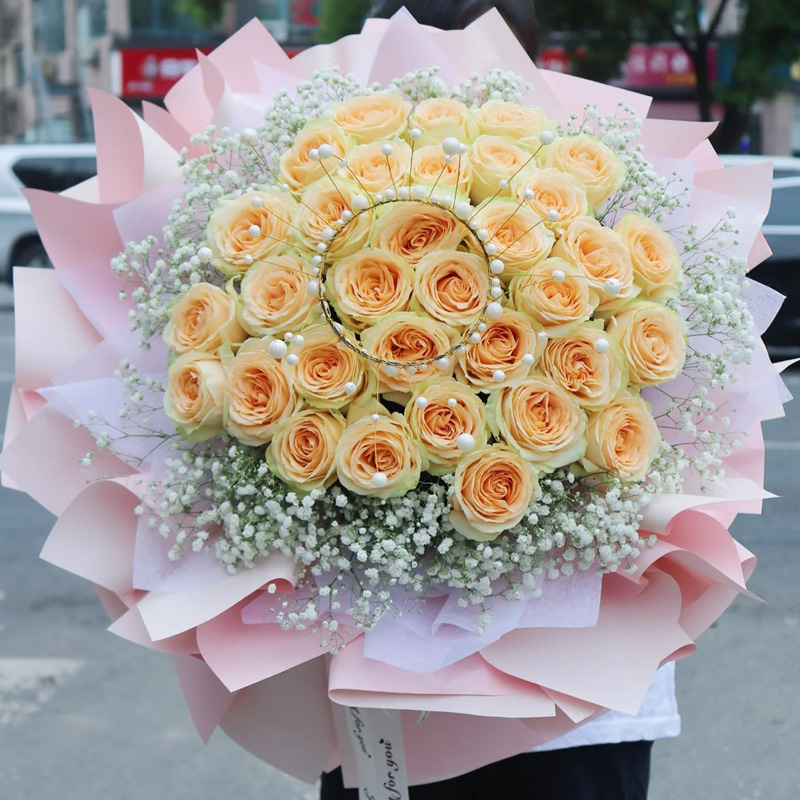 花材: 33朵香槟玫瑰,1个皇冠,搭配满天星环绕。