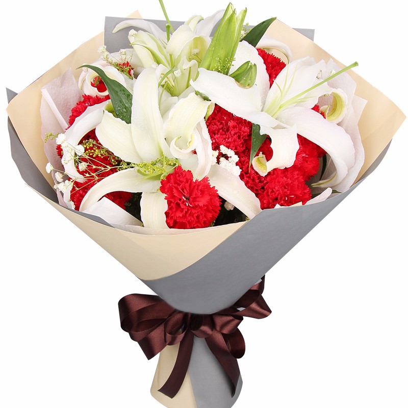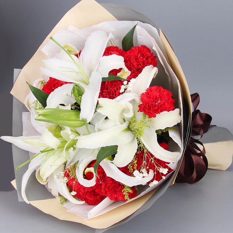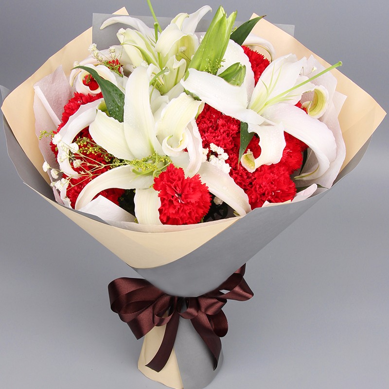 花材: 16支红色康乃馨,2支多头白百合,搭配适量满天星。