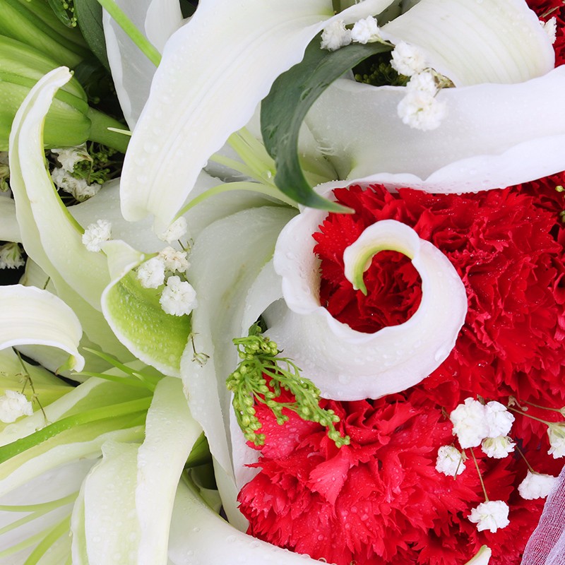 花 材:16支红色康乃馨,2支多头白百合,搭配适量满天星。