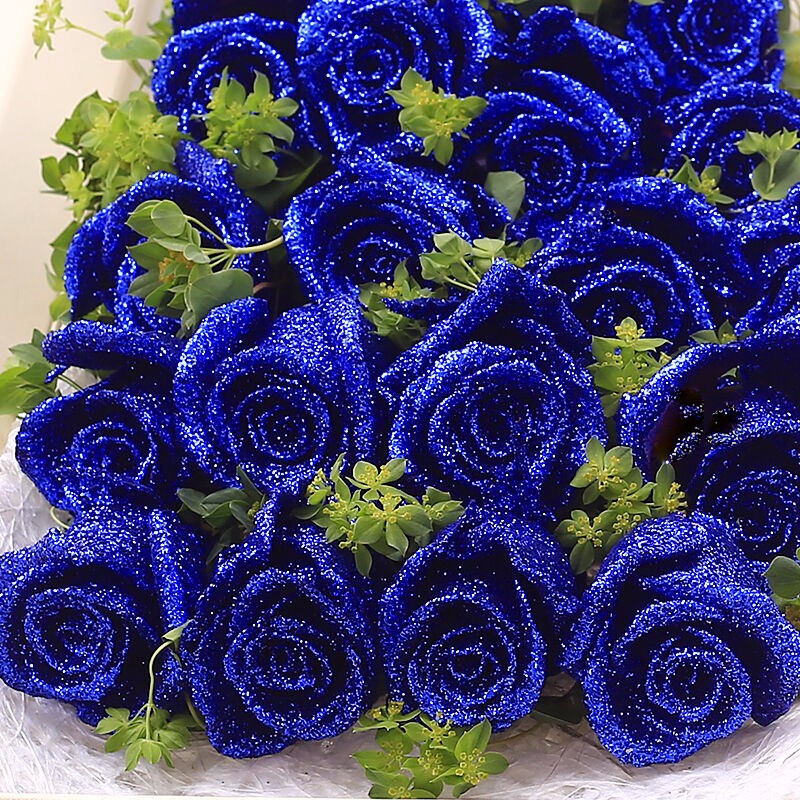 花 材:19支精品蓝色妖姬,搭配适量叶上黄金。