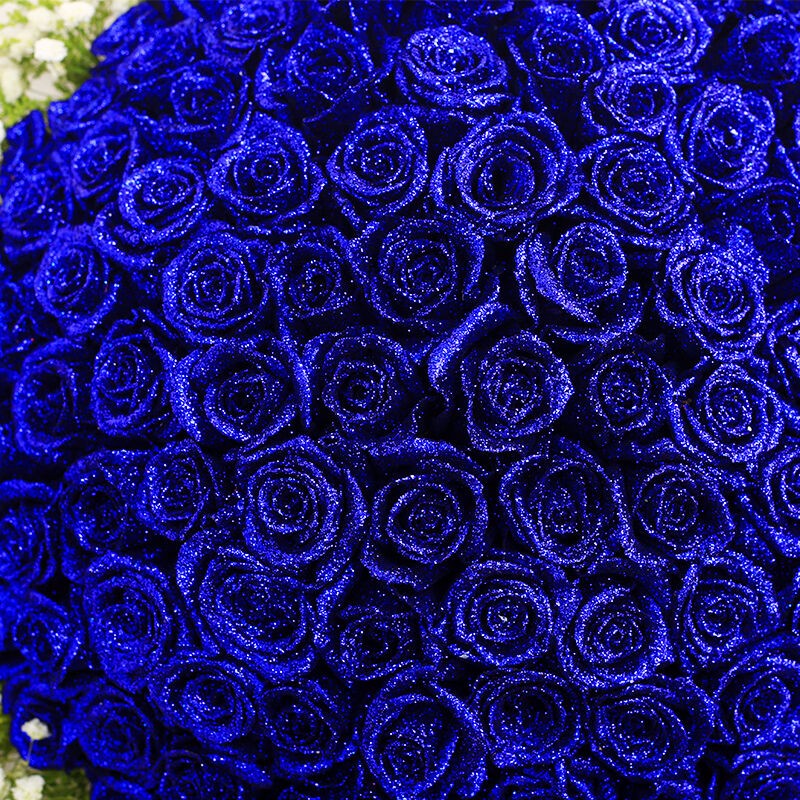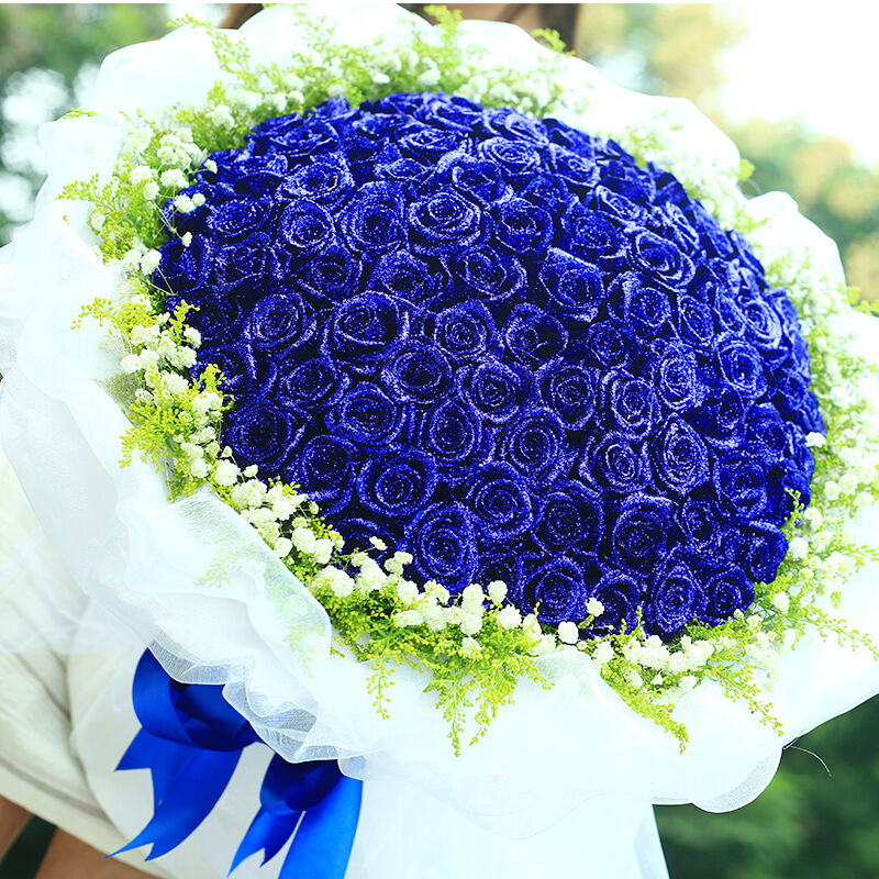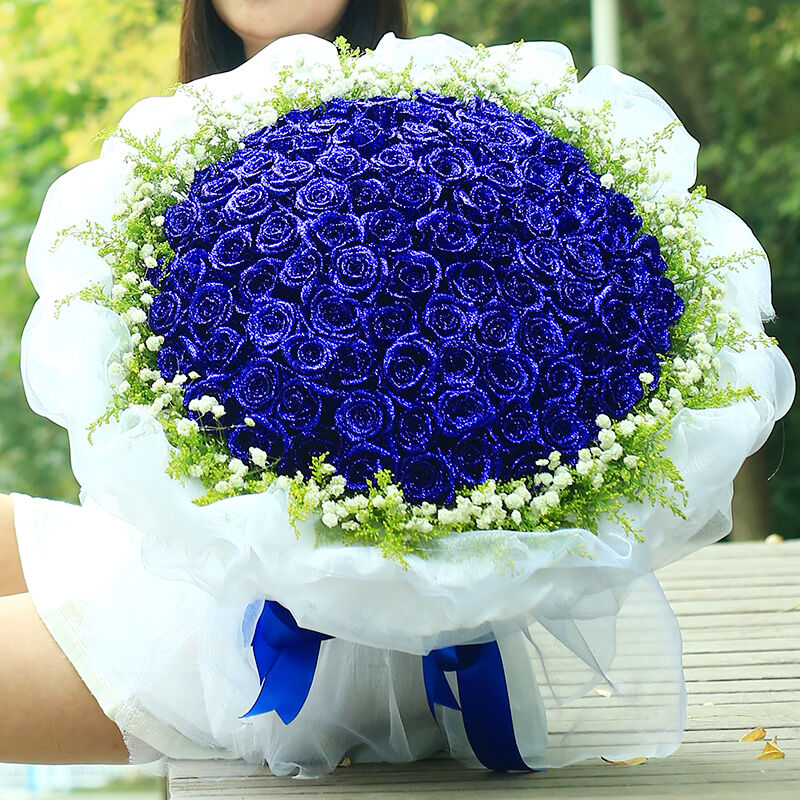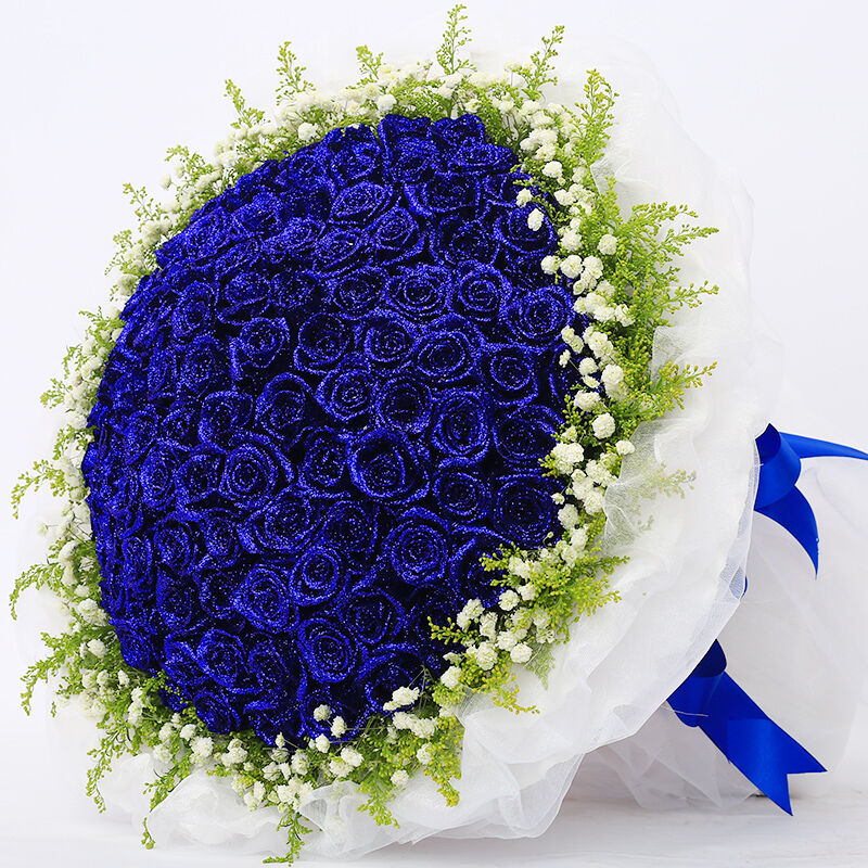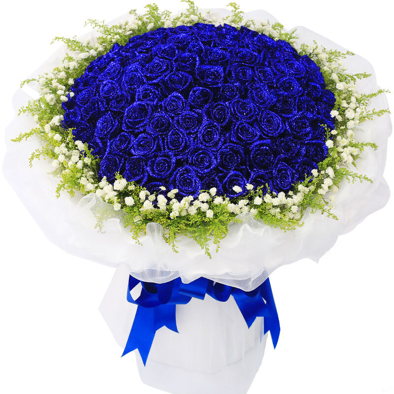 花材: 99支精品蓝色妖姬,外围搭配适量黄莺、白色满天星。