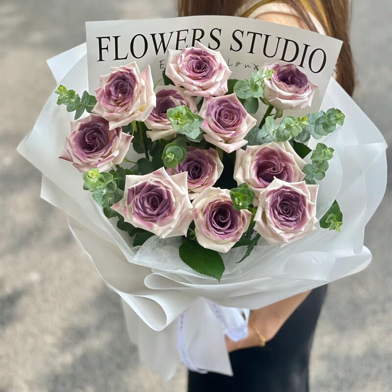 花 材:11朵曼塔玫瑰喷色乌梅子酱,搭配尤加利叶装饰。(珍贵稀少花材,请提前预订或咨询花艺师)