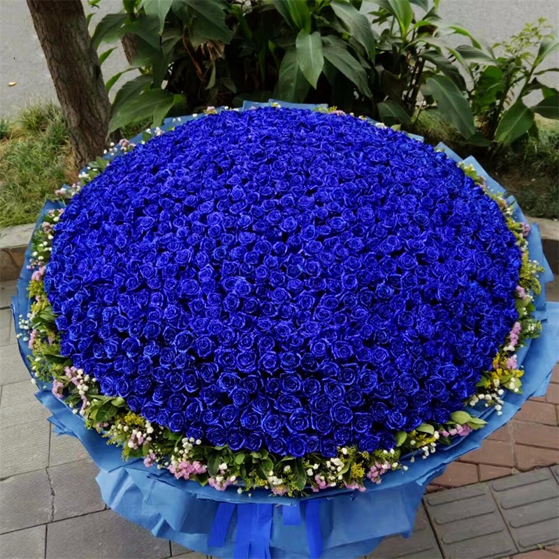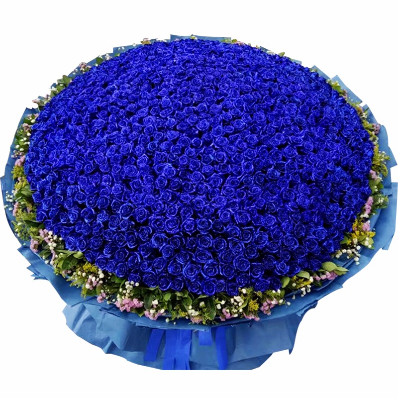 花 材:999支精品蓝色妖姬,外围搭配适量白色满天星、粉色勿忘我、黄莺、栀子叶(请提前3~5天订购或订购前咨询客服)