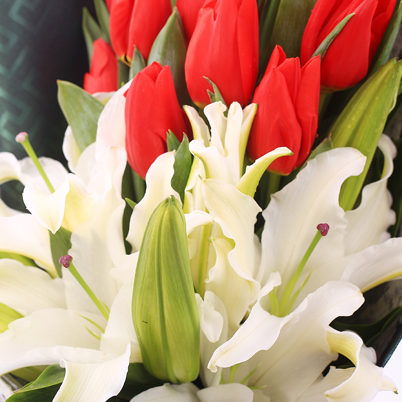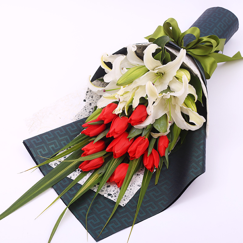 花材: 11支精品红色郁金香,搭配3支多头百合。