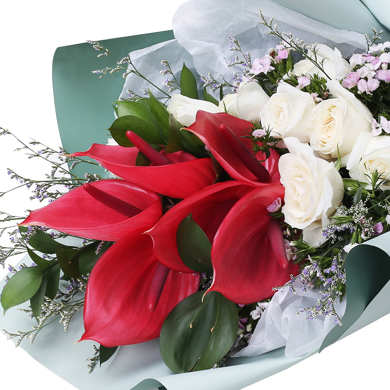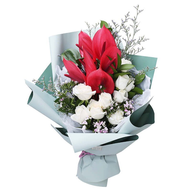 花材: 9朵白玫瑰,5枝红掌,搭配相思梅、水晶草、栀子叶。