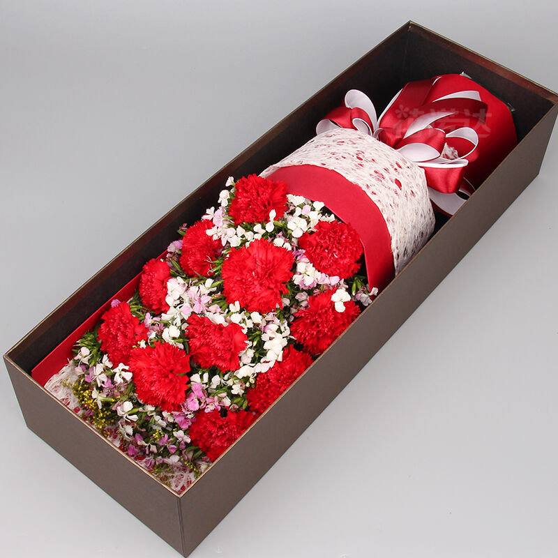 花材: 11支精品红康乃馨,搭配适量相思梅。