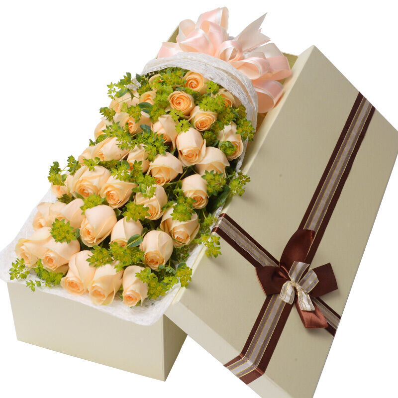 花材: 33朵香槟玫瑰,搭配叶上黄金,丰满围绕。