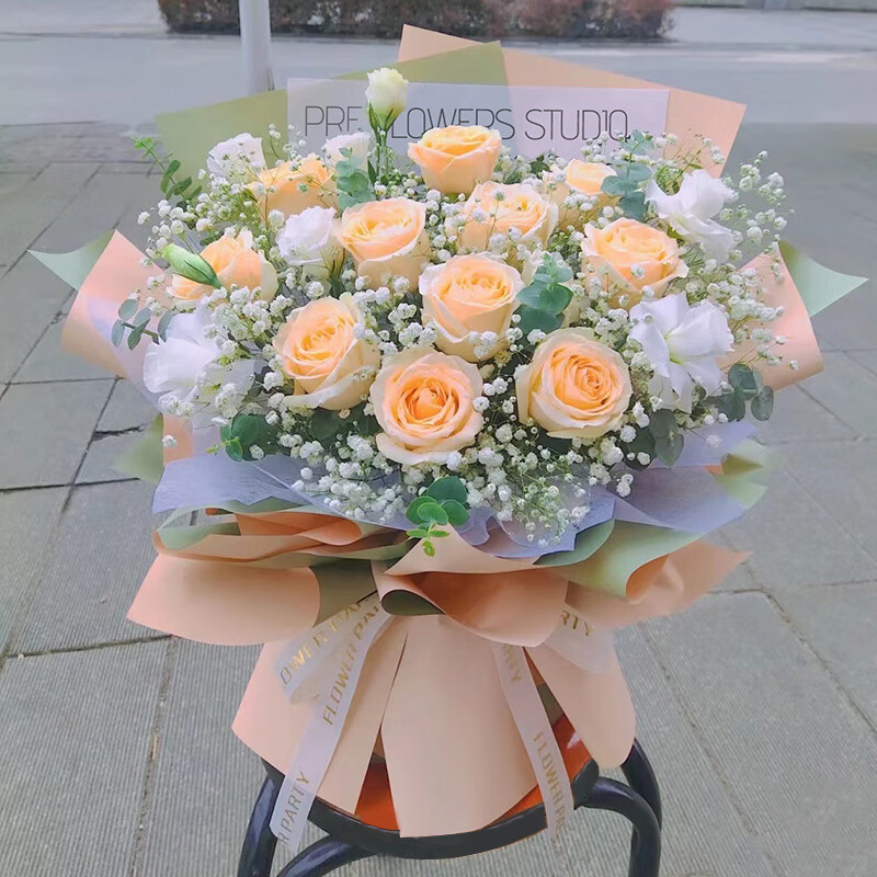 花材: 11朵香槟玫瑰,搭配4支洋桔梗(断货则用4支白玫瑰代替),尤加利叶满天星装饰。
