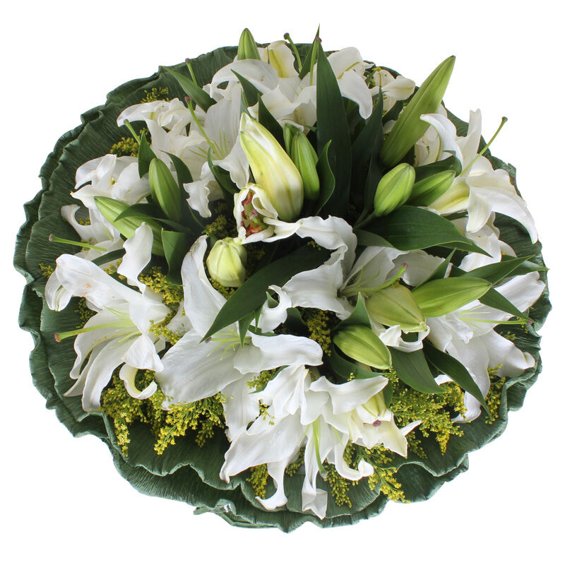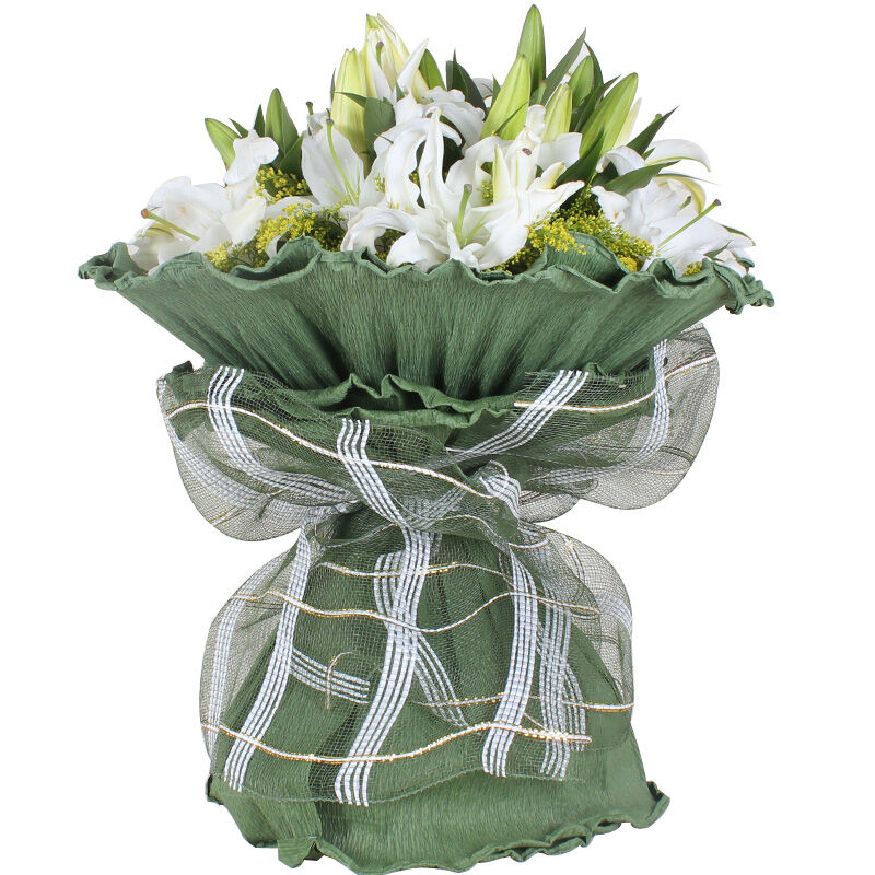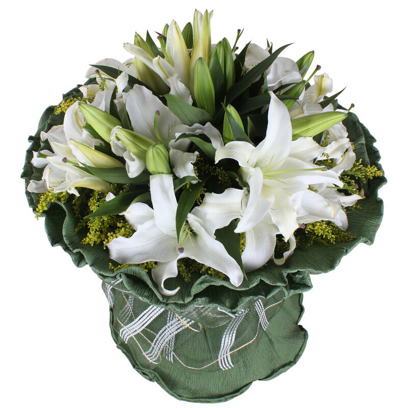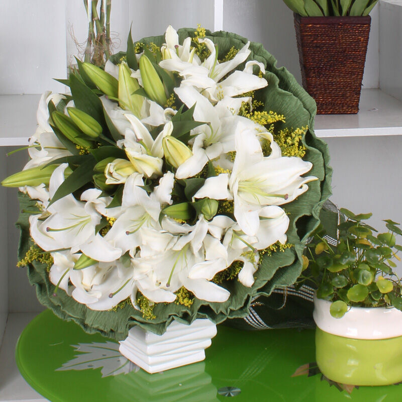 花材: 22朵白色香水百合,黄莺适量搭配。