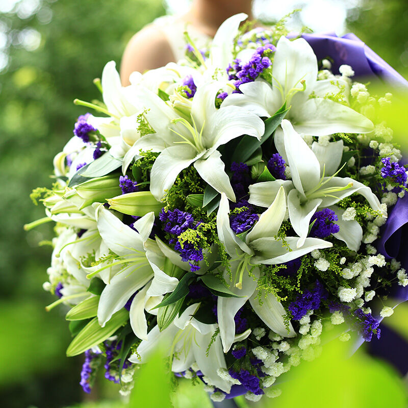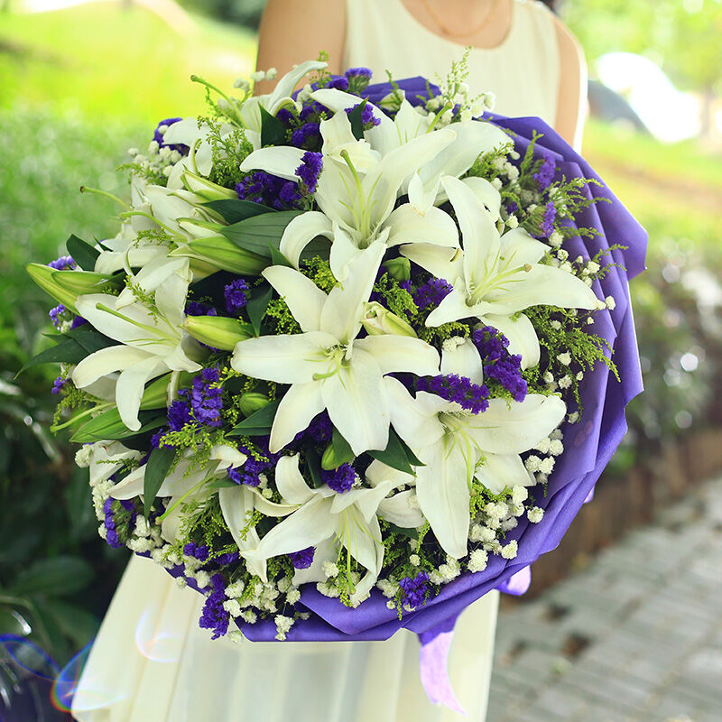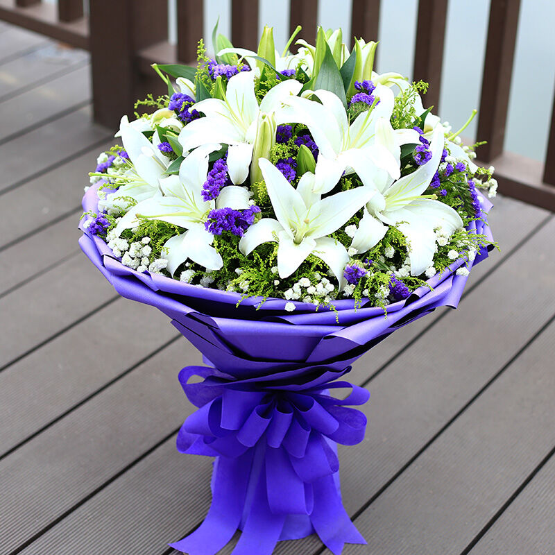 花材: 白百合21朵,搭配紫色勿忘我,绿叶、满天星。
