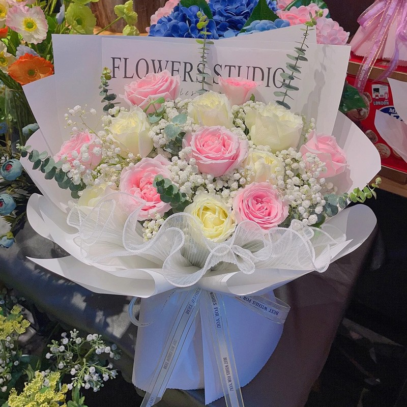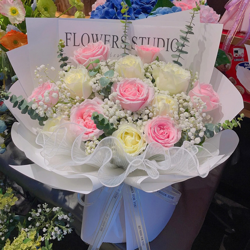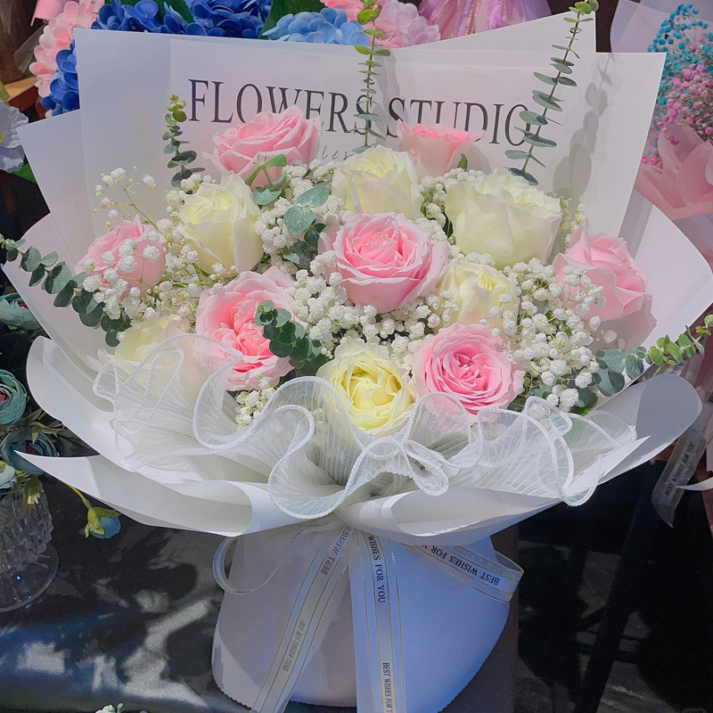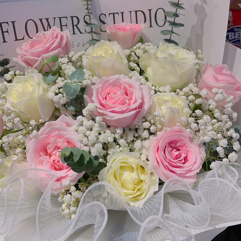 花材: 13朵玫瑰混搭(白玫瑰6朵、粉玫瑰7朵),搭配满天星、尤加利叶间插配饰。