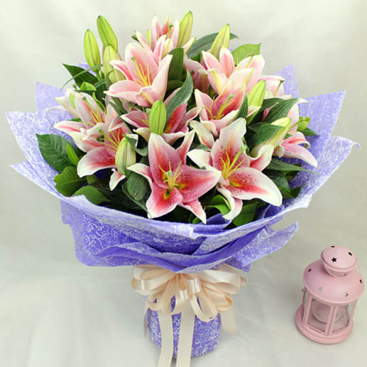 花 材:8枝粉色多头西伯香水百合,搭配绿色新鲜叶材。