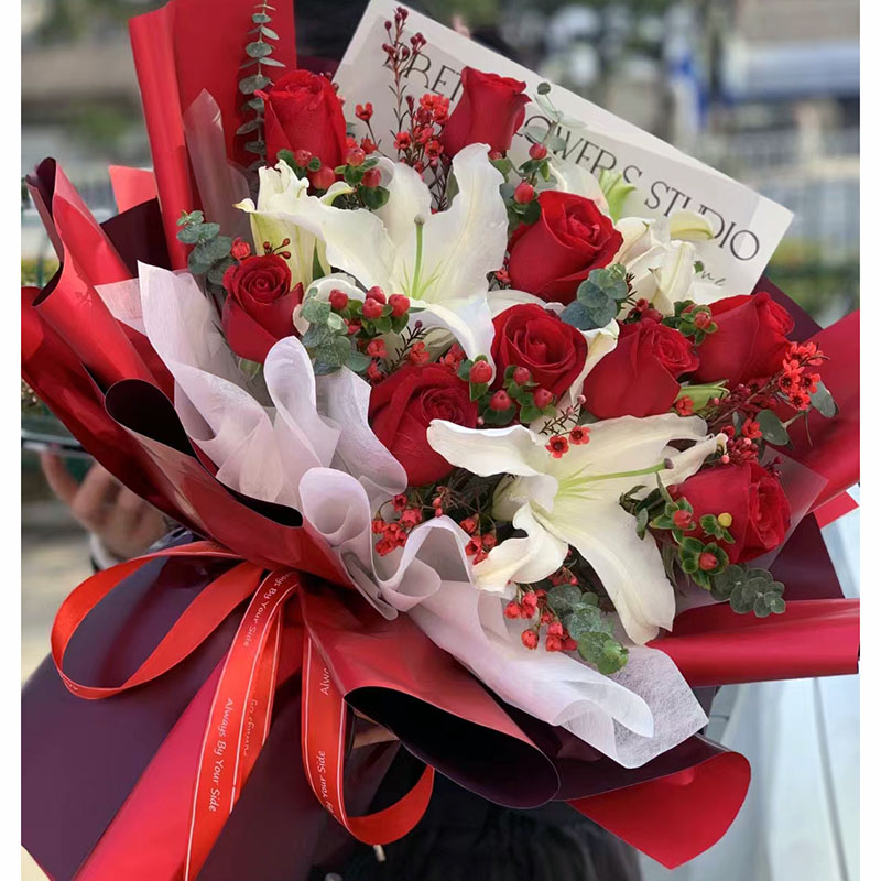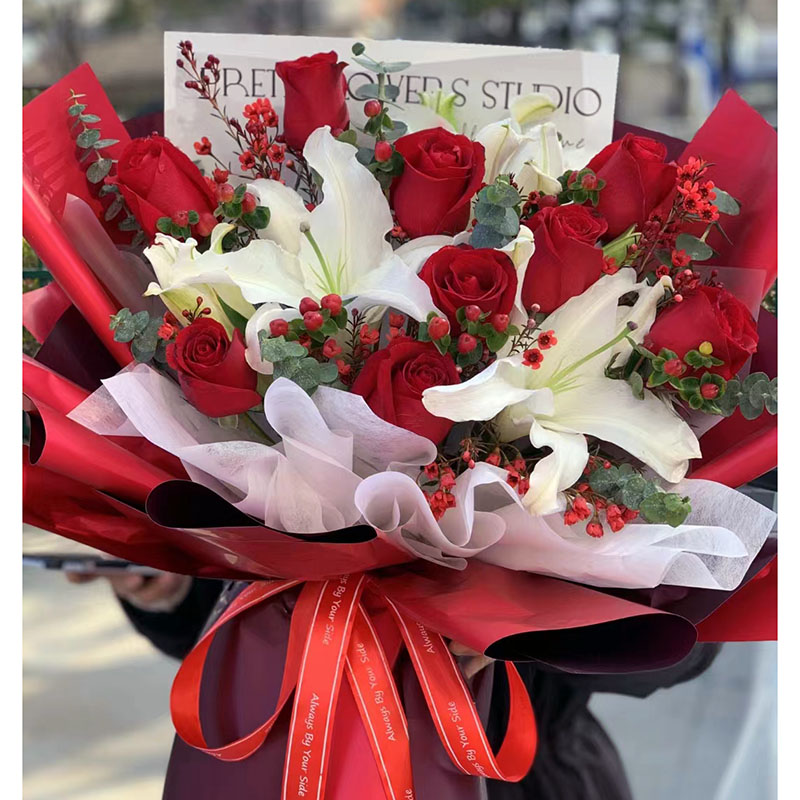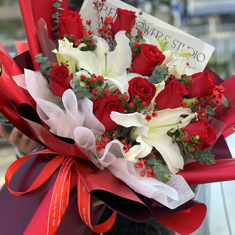 花材: 9朵红玫瑰,2支白色多头香水百合,搭配火龙珠、尤加利叶间插。