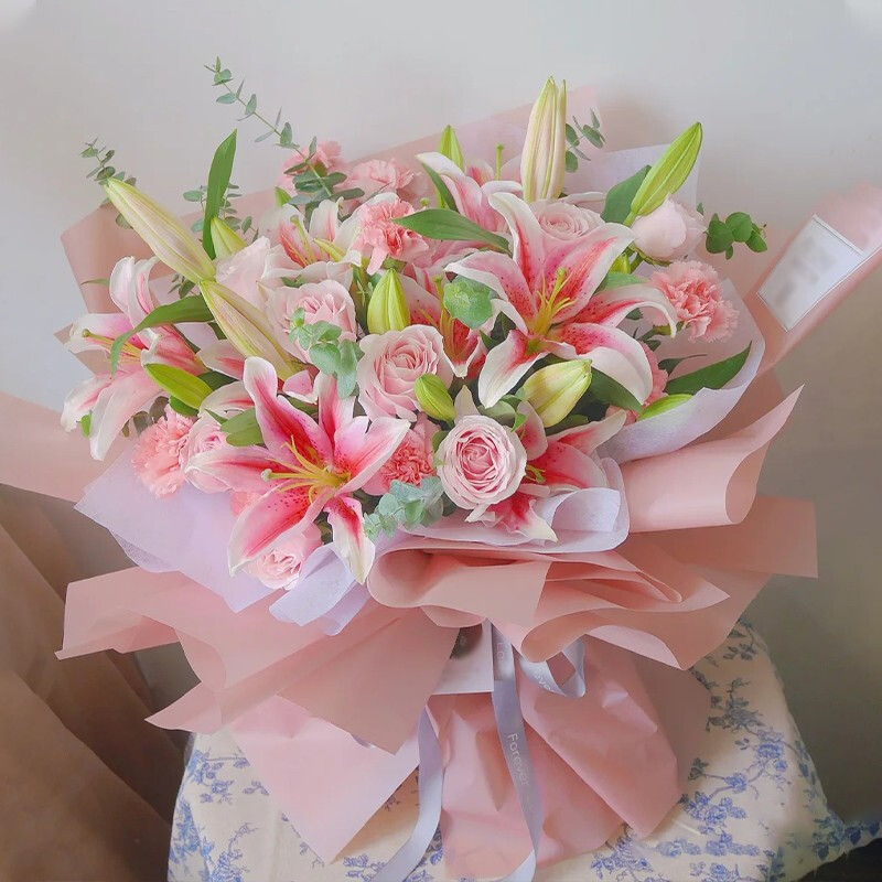 花材: 19朵粉色康乃馨玫瑰混搭(8朵粉玫瑰,11朵粉色康乃馨),5支多头粉色香水百合,搭配尤加利叶装饰。