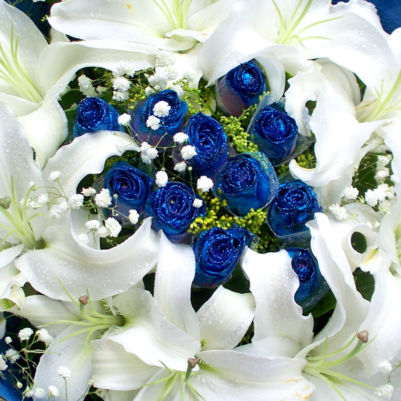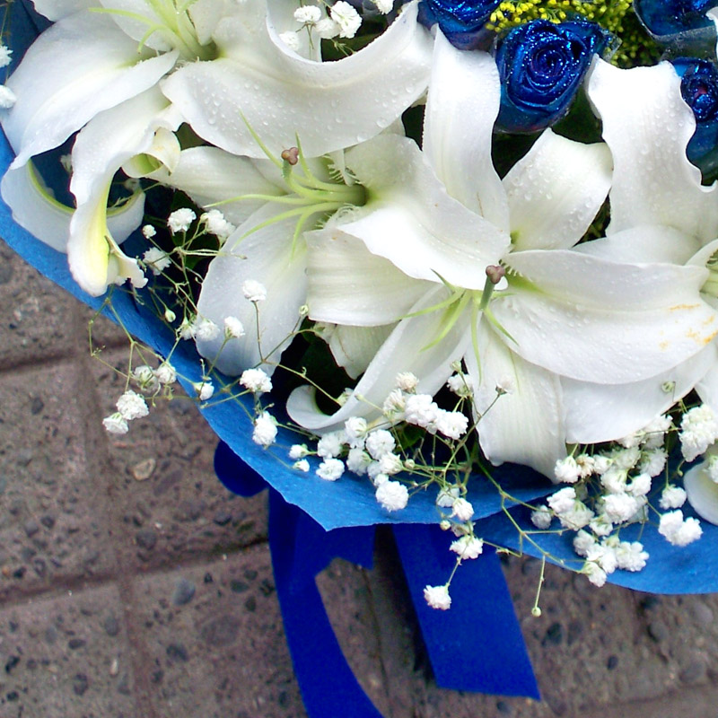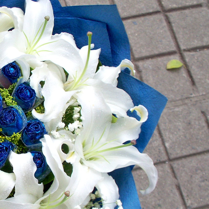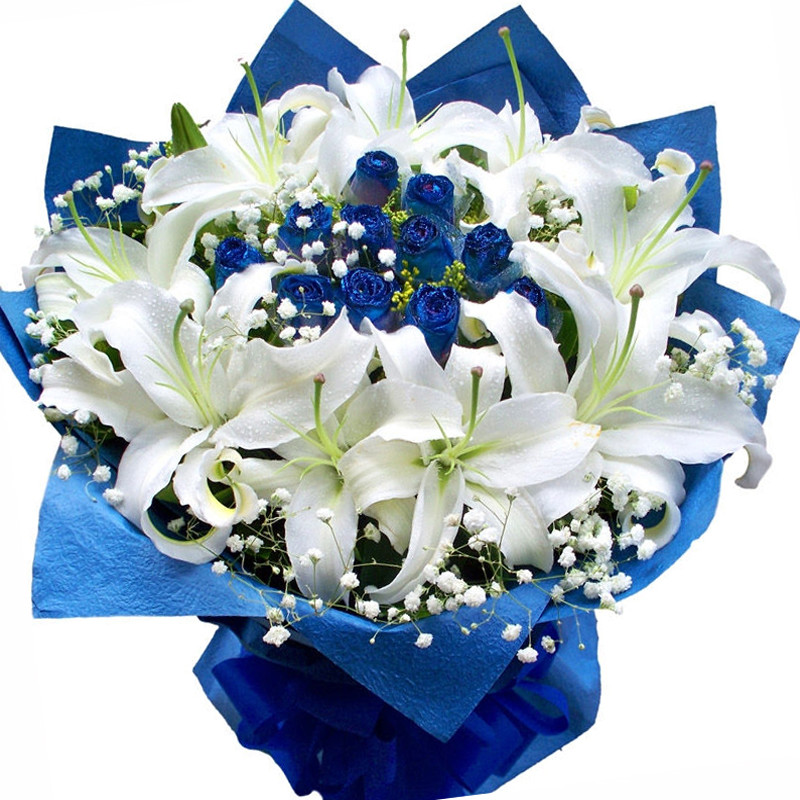 花 材:11支蓝玫瑰+6支多头白百合,搭配满天星。