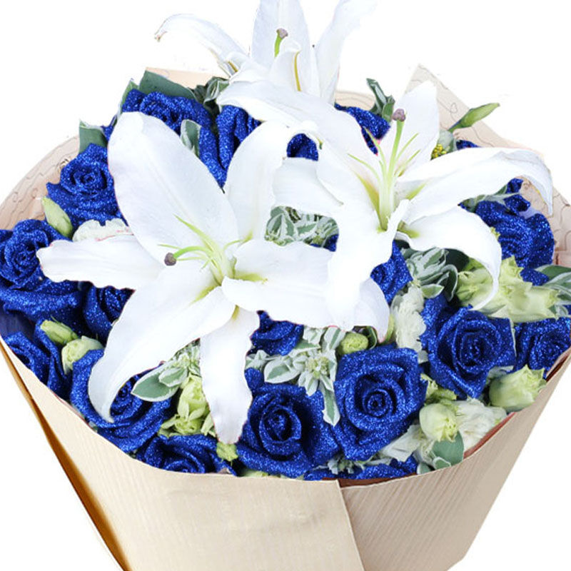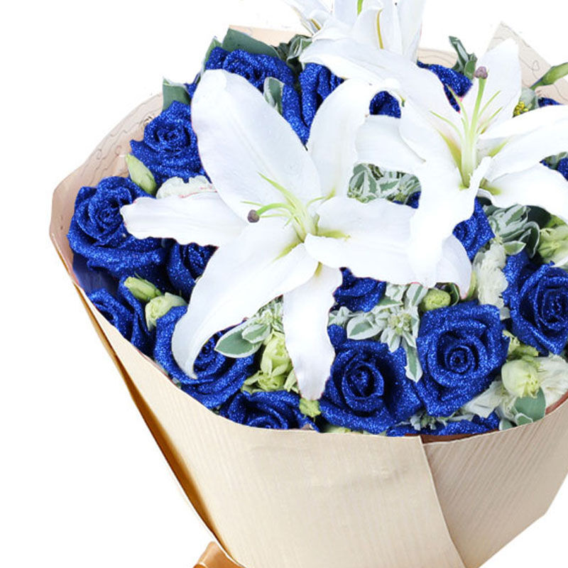 花材: 19支蓝玫瑰+1支多头白百合,搭配叶上花或桔梗、绿叶。