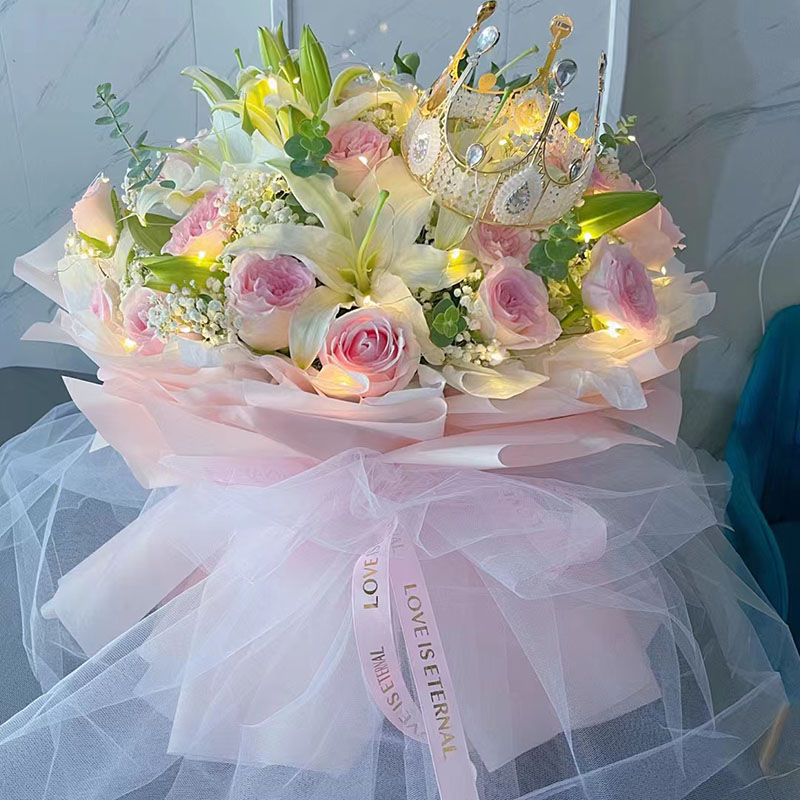 花 材:精选19朵粉玫瑰,4支多头白色香水百合,1条灯带,1个皇冠(款式随机),搭配满天星、尤加利叶间插。