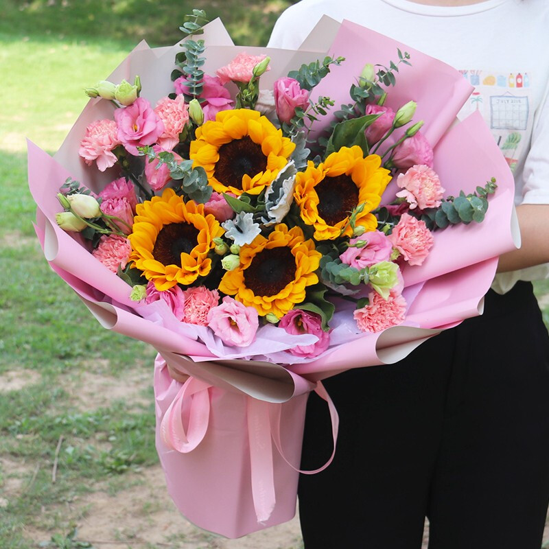 花 材:4支向日葵,8朵粉色康乃馨,6支粉色洋桔梗,尤加利叶装饰。