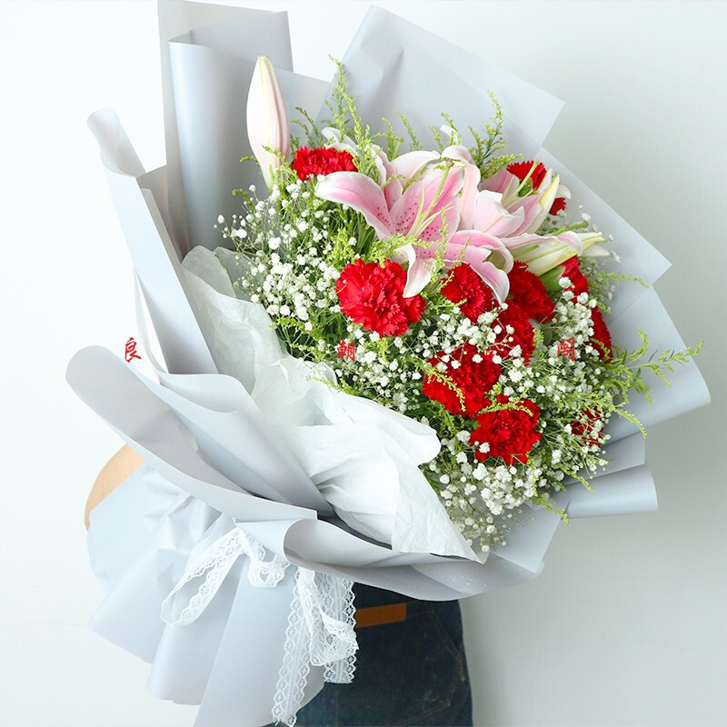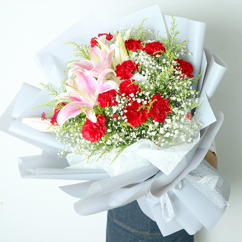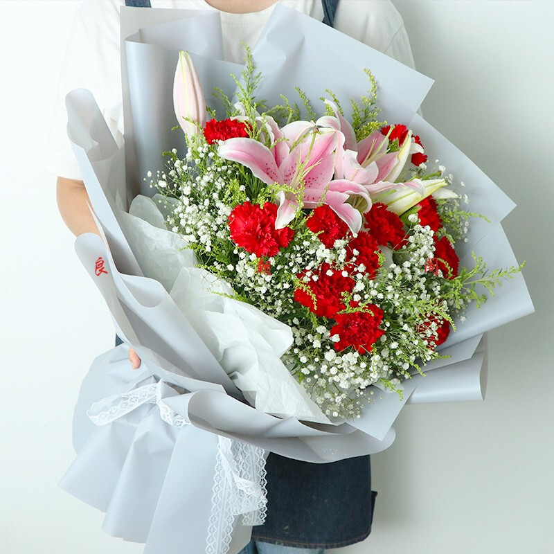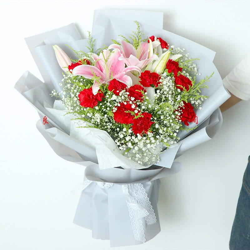 花材: 11朵红色康乃馨,2支粉色多头百合,搭配大量满天星、黄莺草装饰。