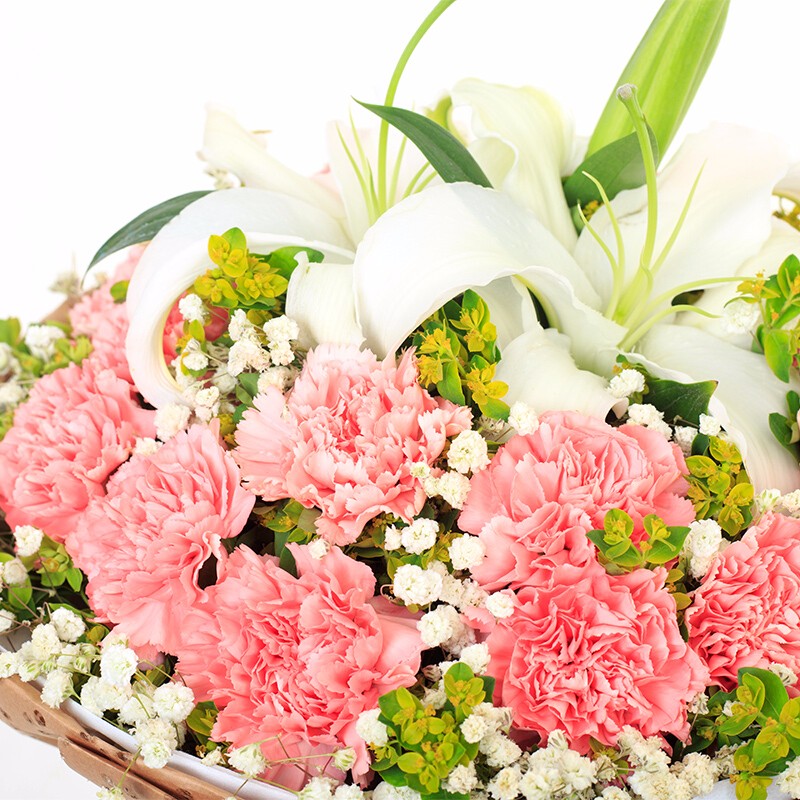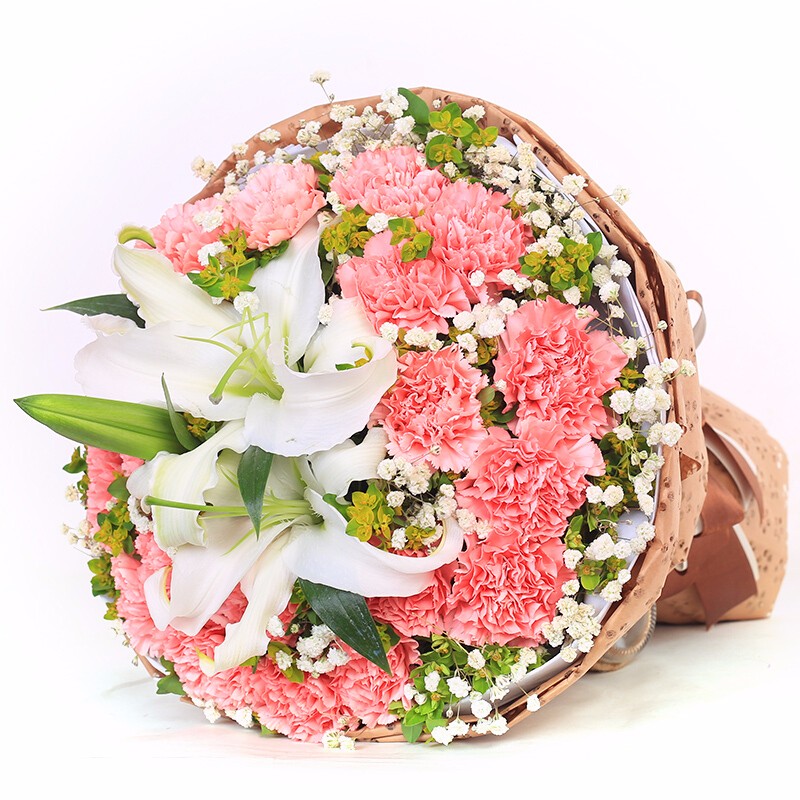 花材: 19朵粉色康乃馨,1枝香水百合,搭配满天星。