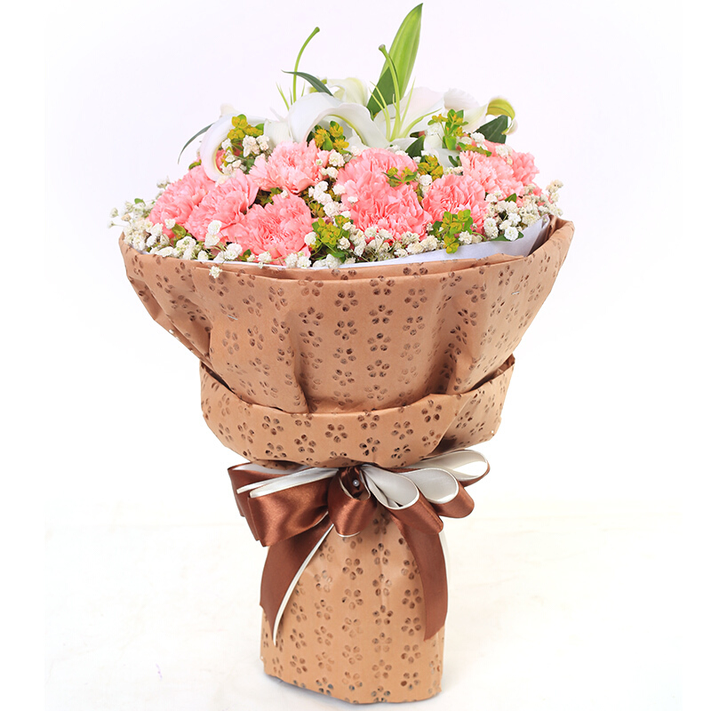 花 材:19朵粉色康乃馨,1枝香水百合,搭配满天星。