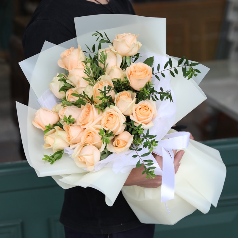 花材: 19支香槟玫瑰,搭配适量细叶尤加利叶装饰。