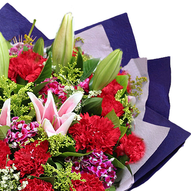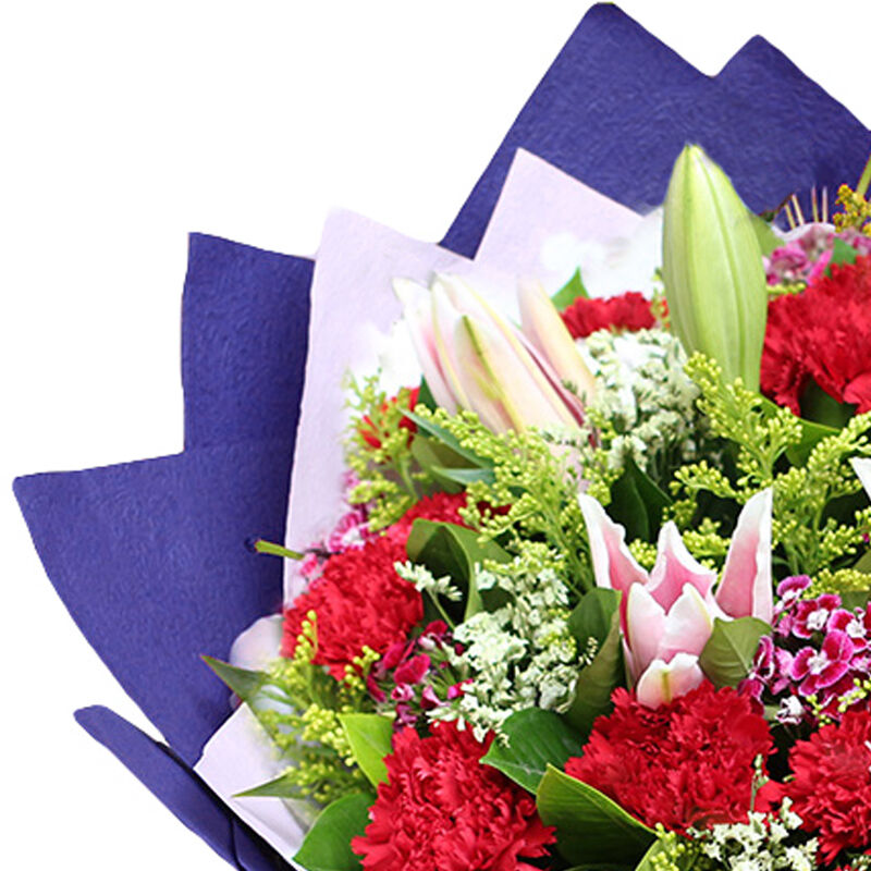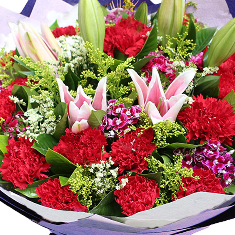 花材: 19支红色康乃馨+2支粉色多头百合,搭配黄莺、石竹梅、满天星。