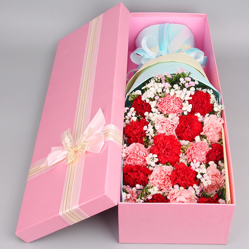 花材: 19支混色康乃馨(红康乃馨+粉红康乃馨),搭配石竹梅、黄莺。