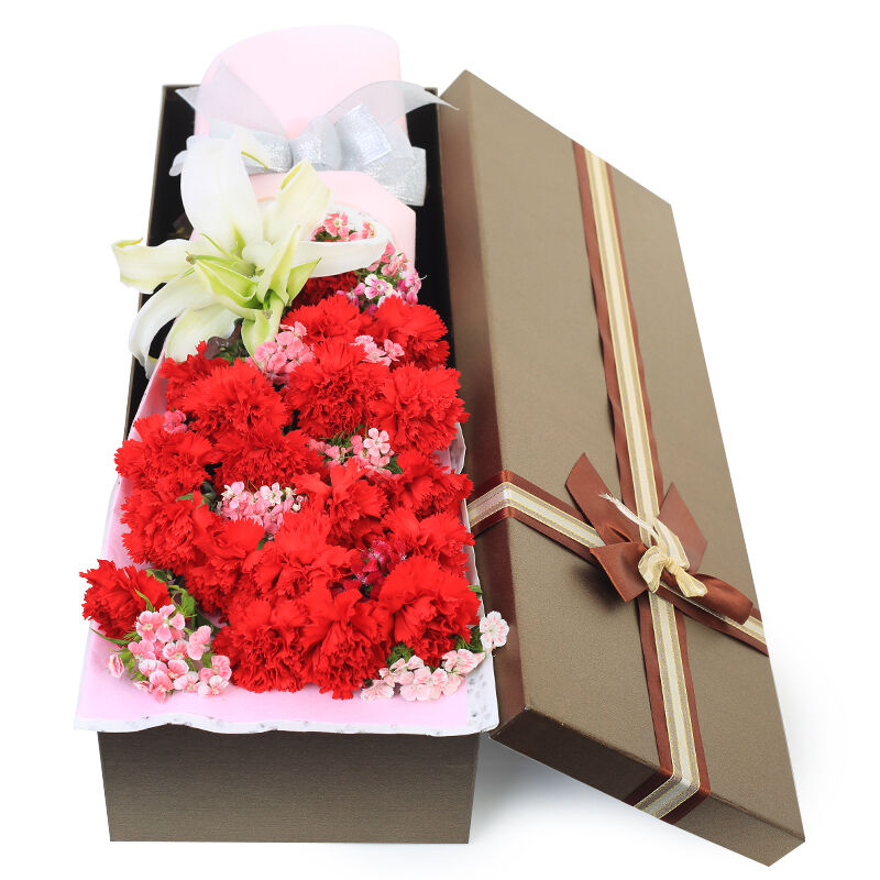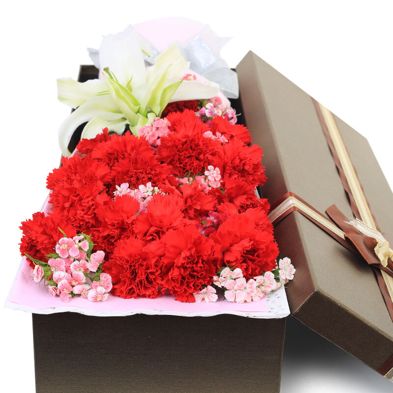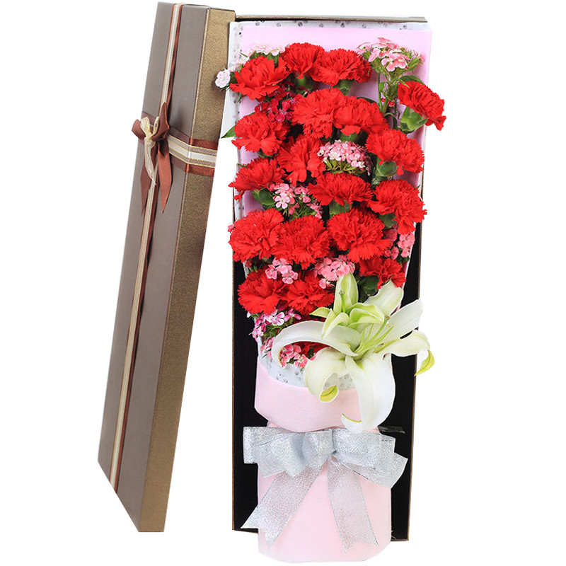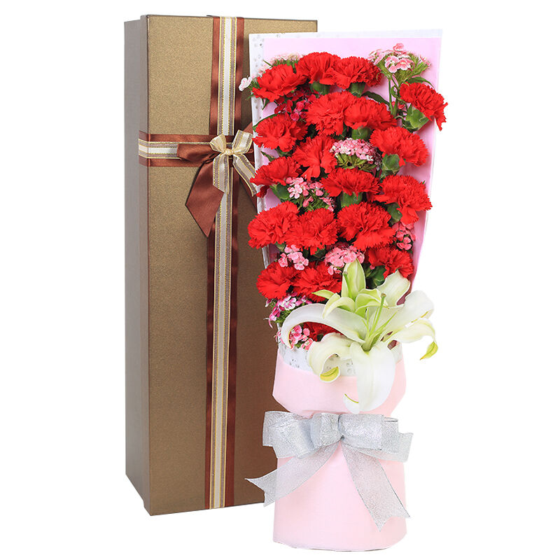 花材: 19支红色康乃馨+1支多头白百合,搭配石竹梅。