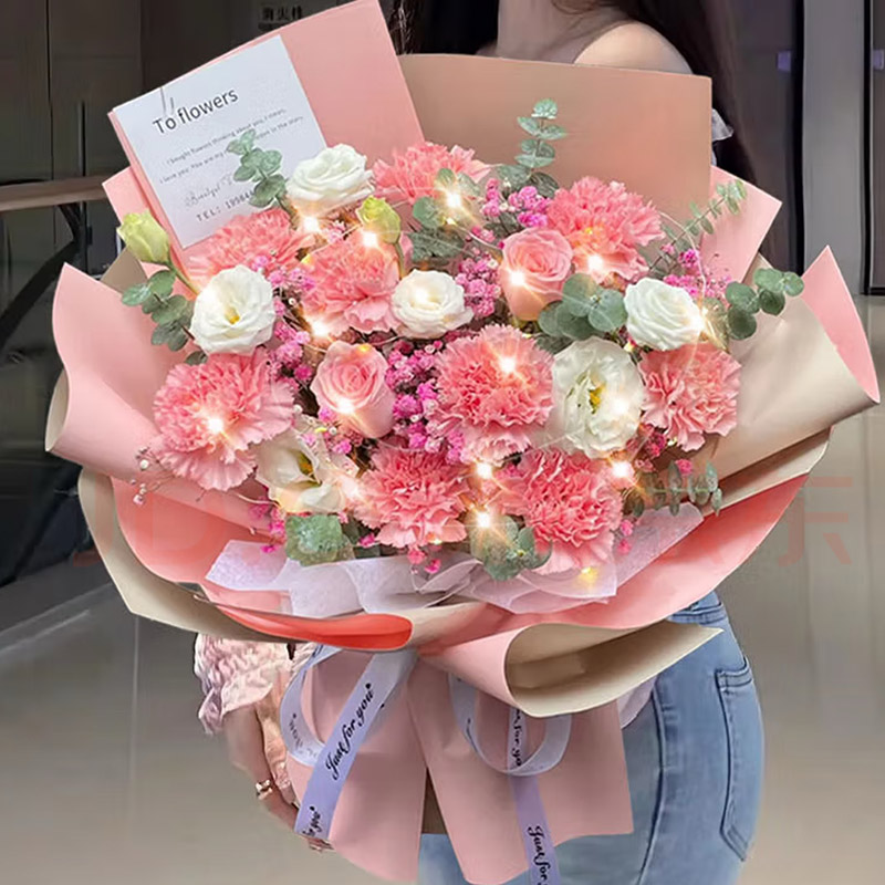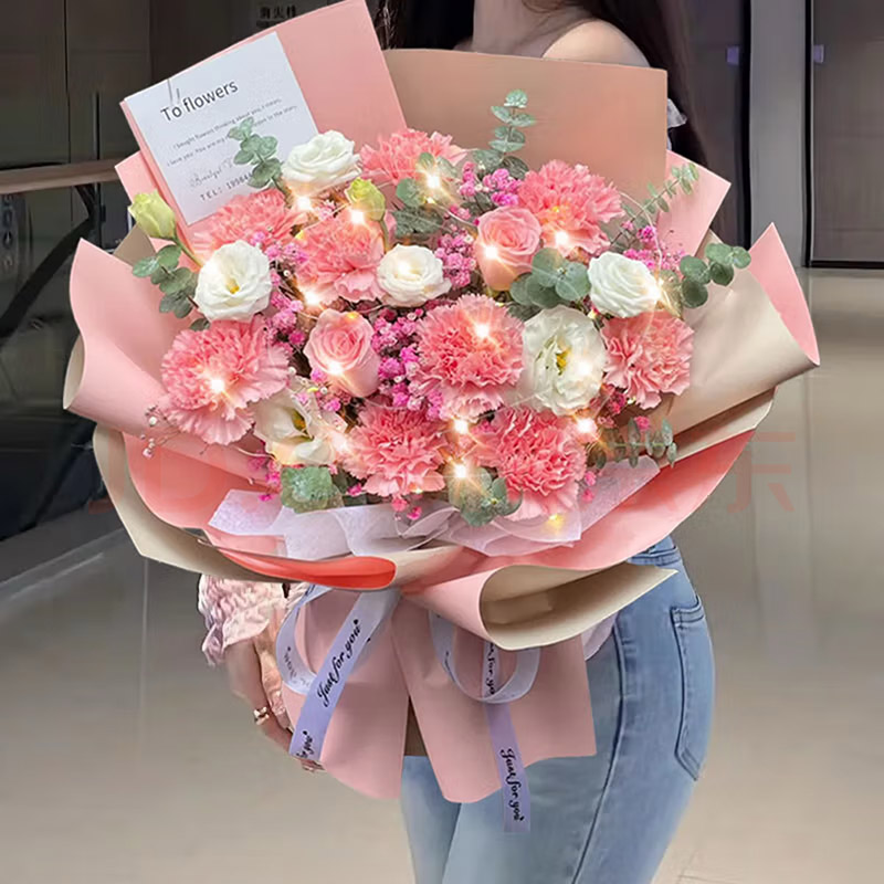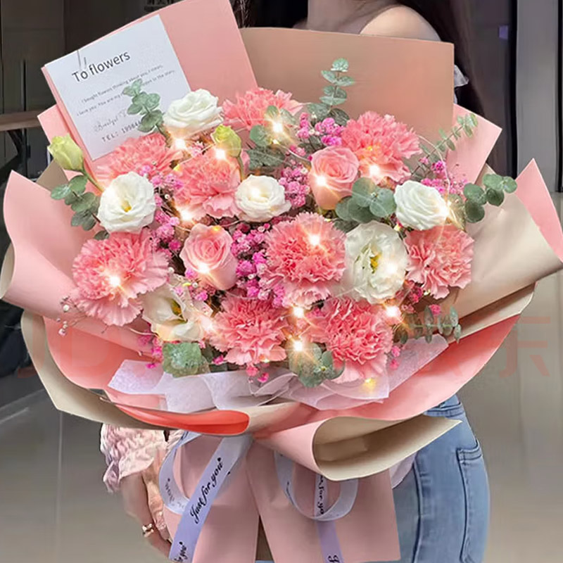 花 材:粉色康乃馨、粉色玫瑰共11朵,4支洋桔梗,1条灯串,搭配粉色满天星,尤加利叶装饰。