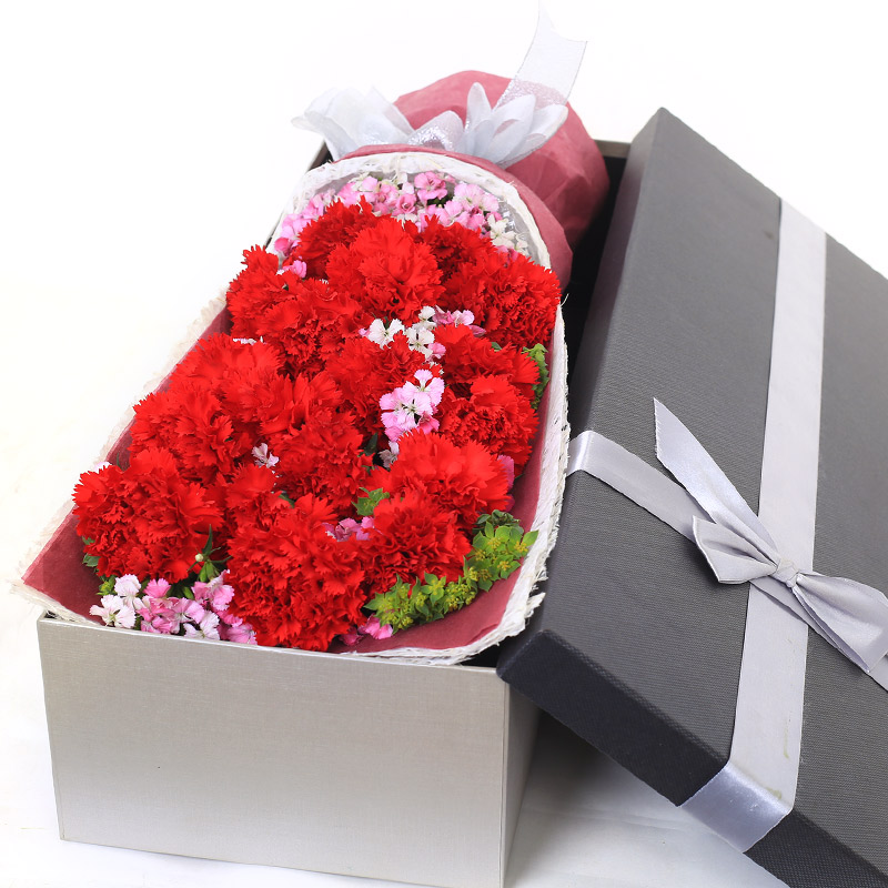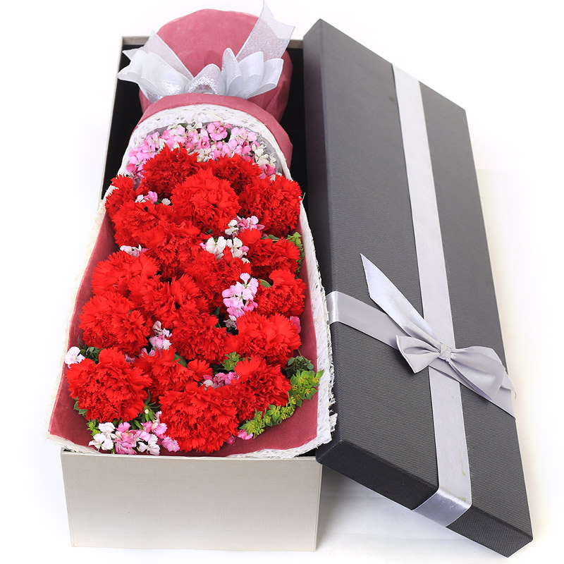 花材: 19支红色康乃馨,搭配适量石竹。