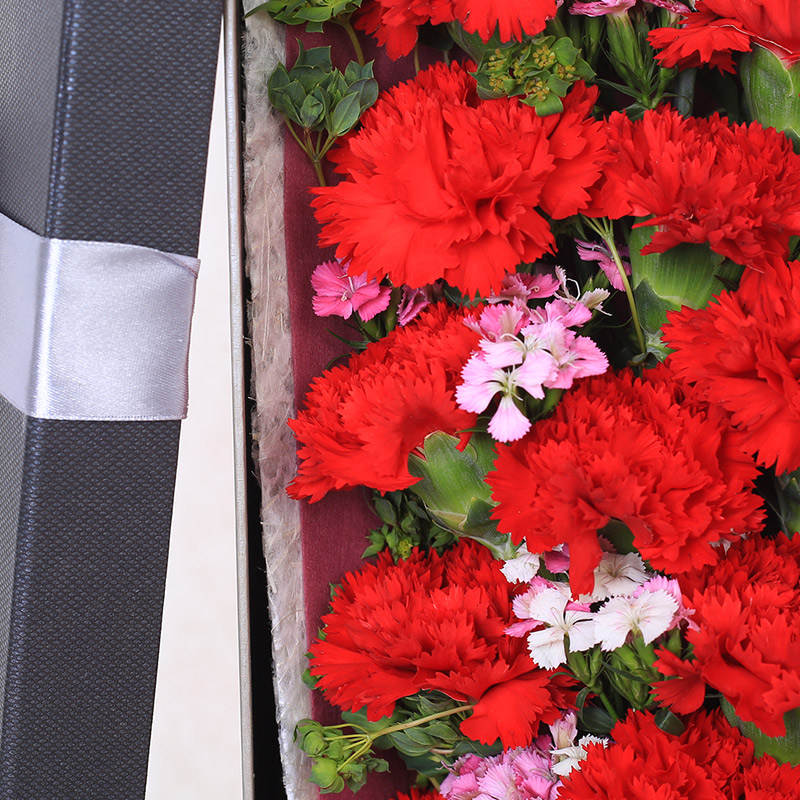 花 材:19支红色康乃馨,搭配适量石竹。