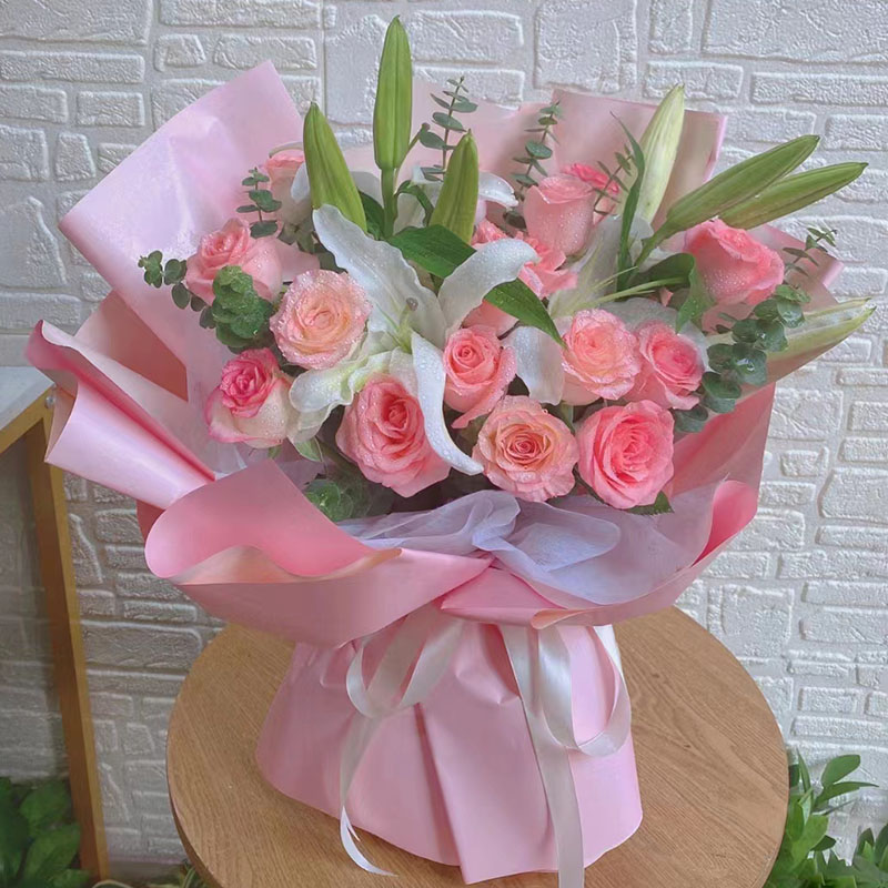 花 材:11朵粉玫瑰,2支多头白色香水百合,搭配4支粉色洋桔梗(断货则用4支粉康代替),尤加利叶装饰。
