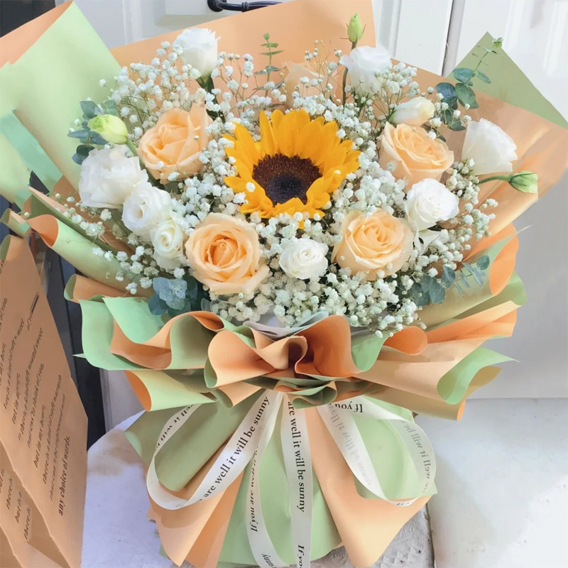 花 材:精选1支向日葵,4支香槟玫瑰,6支洋桔梗,满天星、尤加利叶间插装饰。