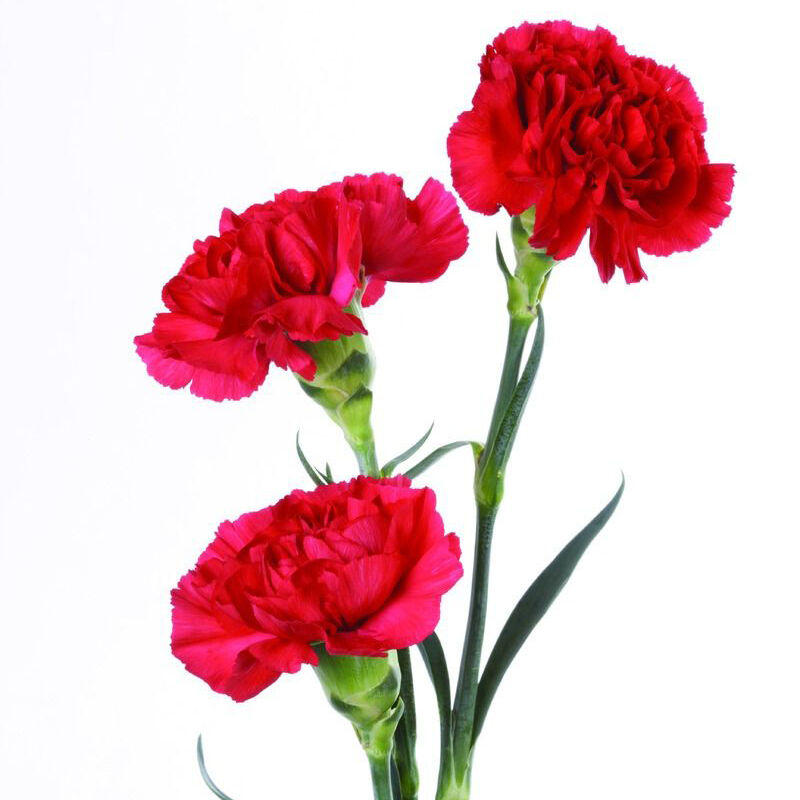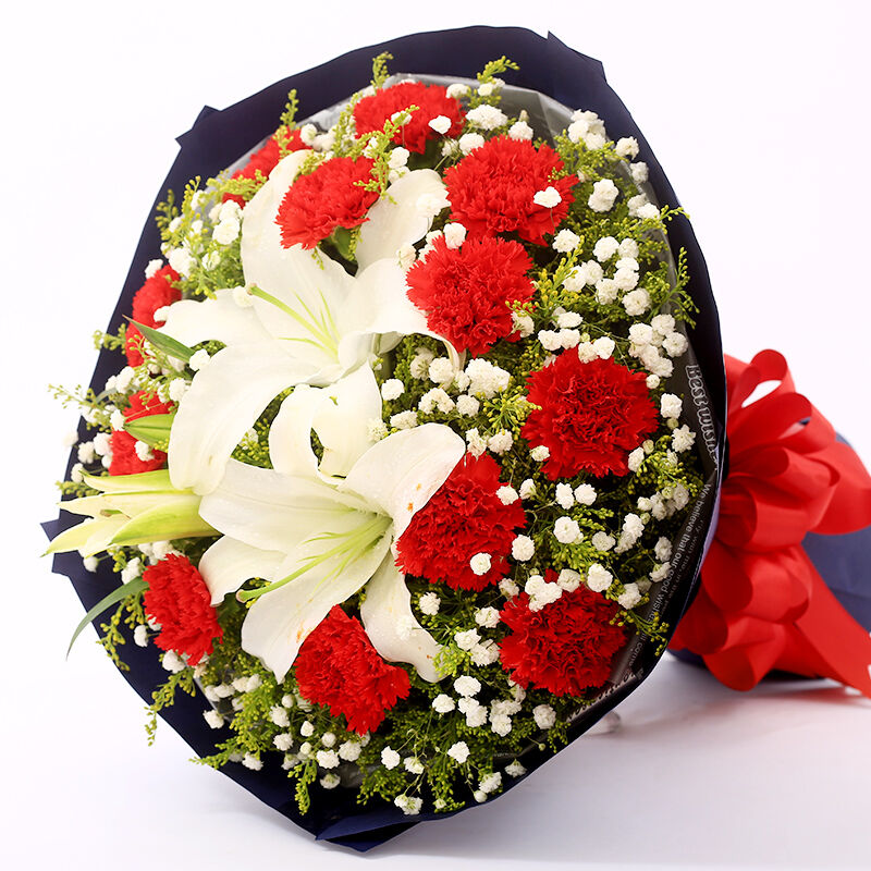 花材: 11支红色康乃馨+1支多头白百合,搭配黄莺、满天星。