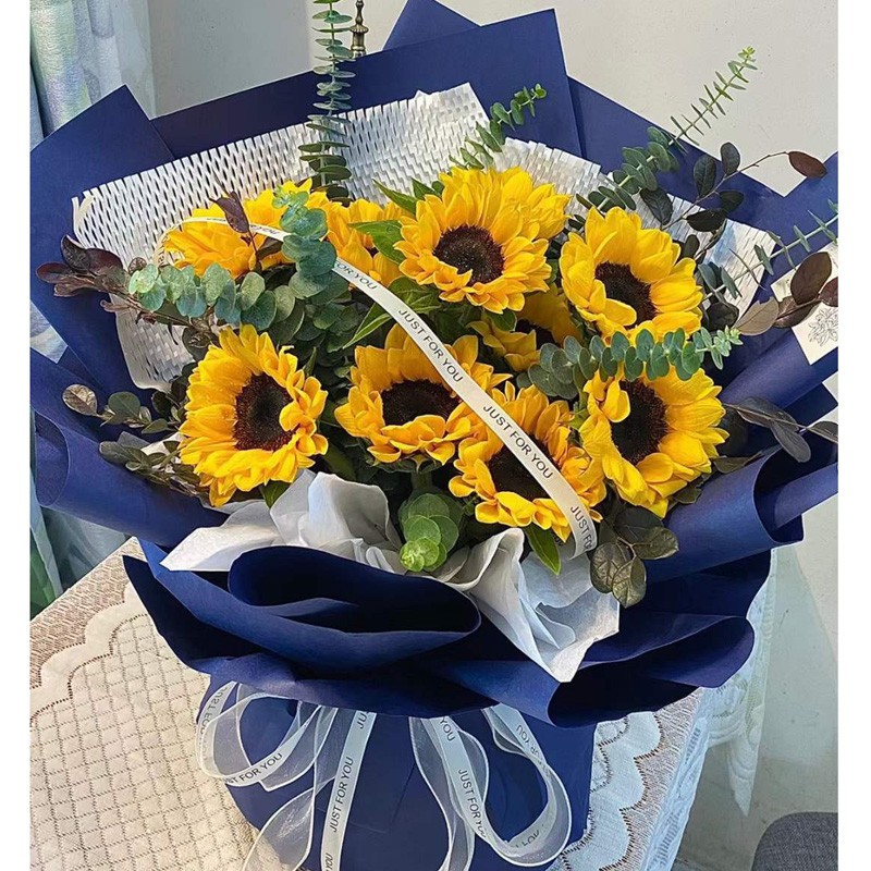花 材:9朵向日葵,搭配尤加利叶装饰。