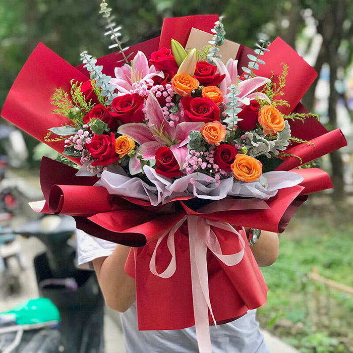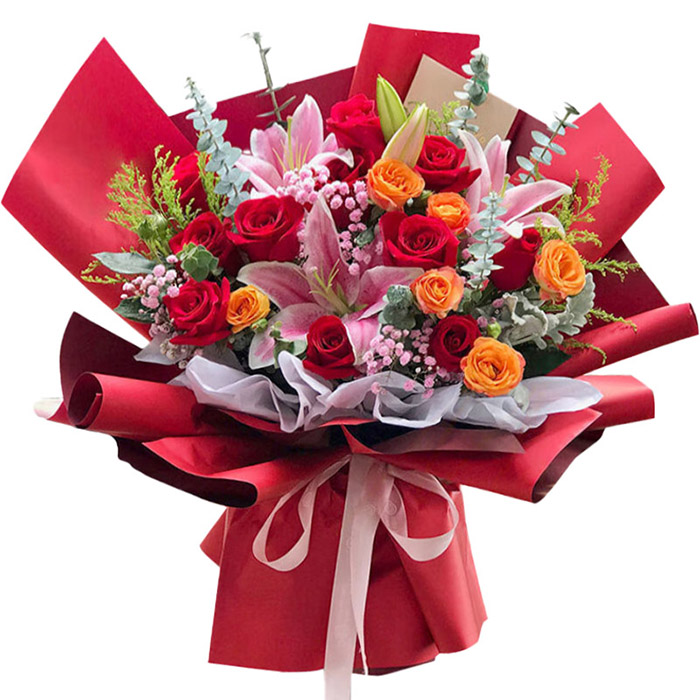 花材: 11支红玫瑰,2支多头粉色香水百合,3支橙色泡泡,搭配粉色满天星、尤加利叶装饰。