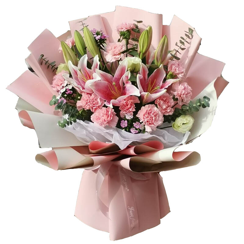 花 材:11支粉色康乃馨,2支粉色多头百合,搭配桔梗、尤加利叶、石竹梅点缀。