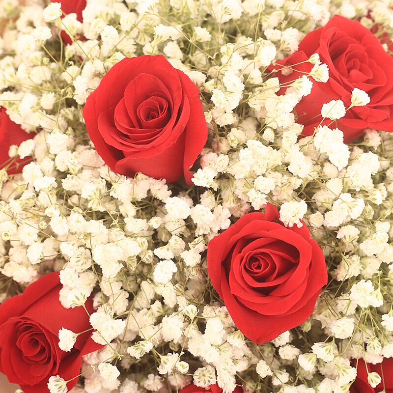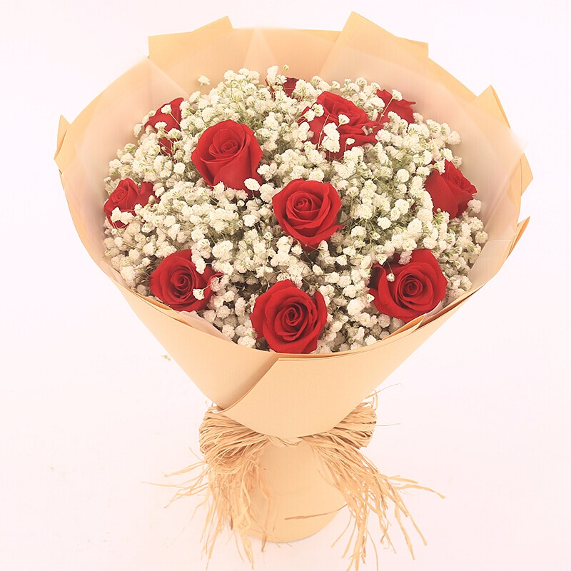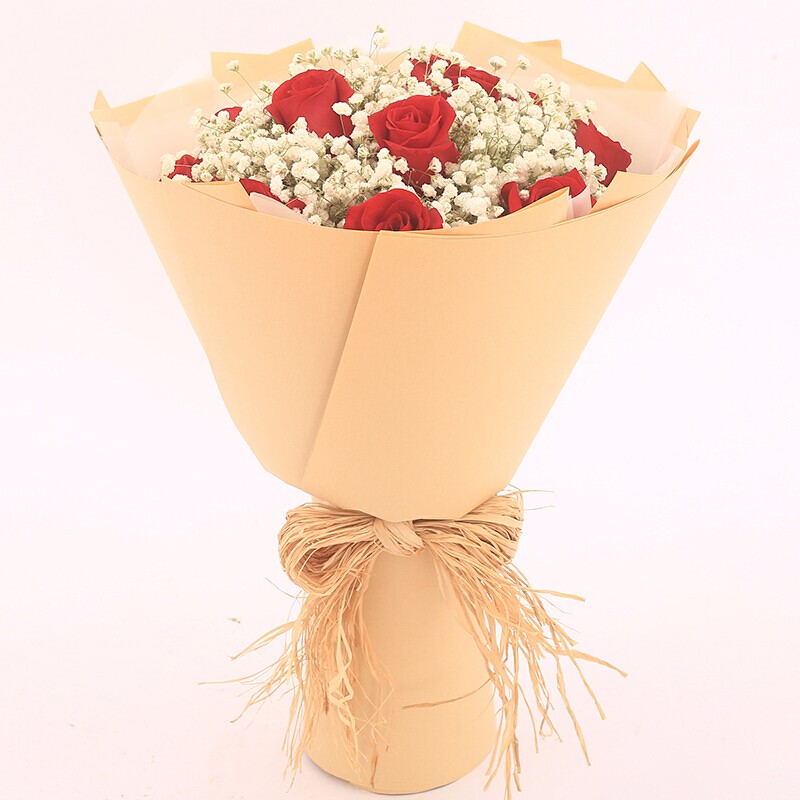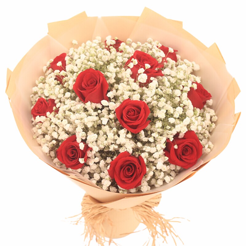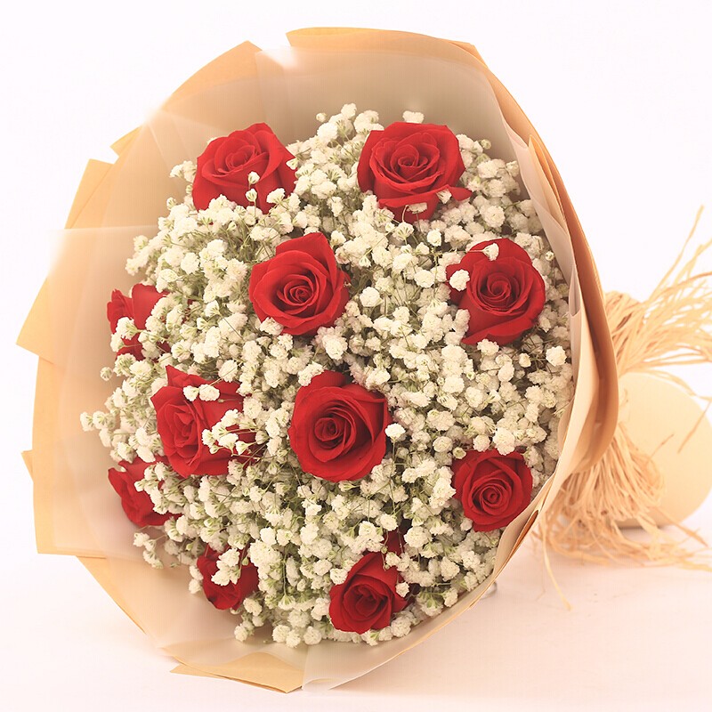 花 材:11朵红玫瑰,0.5扎满天星丰满环绕。